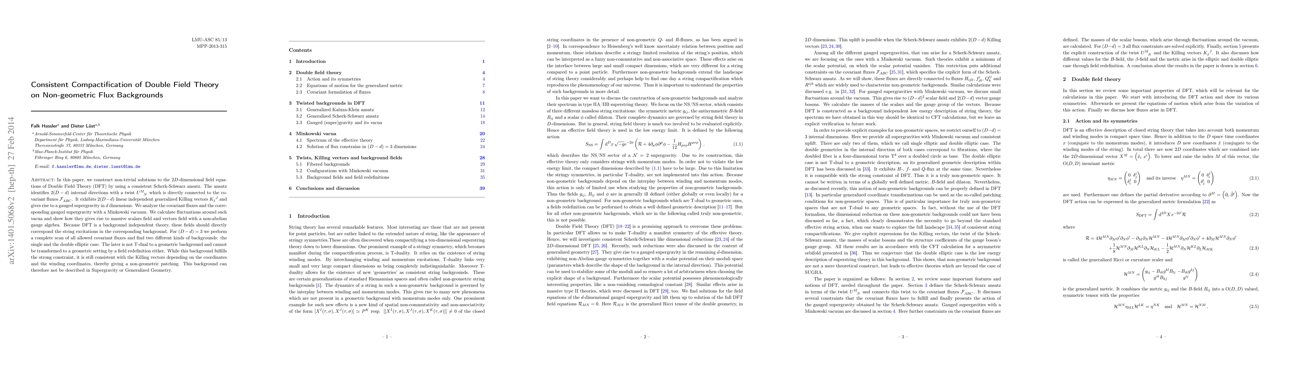 In this paper, we construct non-trivial solutions to the $2D$-dimensional field equations of Double Field Theory (DFT) by using a consistent Scherk-Schwarz ansatz. The ansatz identifies $2(D-d)$ internal directions with a twist $U^M{}_N$ which is directly connected to the covariant fluxes $\mathcal{F}_{ABC}$. It exhibits $2(D-d)$ linear independent generalized Killing vectors $K_I{}^J$ and gives rise to a gauged supergravity in $d$ dimensions. We analyze the covariant fluxes and the corresponding gauged supergravity with a Minkowski vacuum. We calculate fluctuations around such vacua and show how they gives rise to massive scalars field and vectors field with a non-abelian gauge algebra. Because DFT is a background independent theory, these fields should directly correspond the string excitations in the corresponding background. For $(D-d)=3$ we perform a complete scan of all allowed covariant fluxes and find two different kinds of backgrounds: the single and the double elliptic case. The later is not T-dual to a geometric background and cannot be transformed to a geometric setting by a field redefinition either. While this background fulfills the strong constraint, it is still consistent with the Killing vectors depending on the coordinates and the winding coordinates, thereby giving a non-geometric patching. This background can therefore not be described in Supergravity or Generalized Geometry.