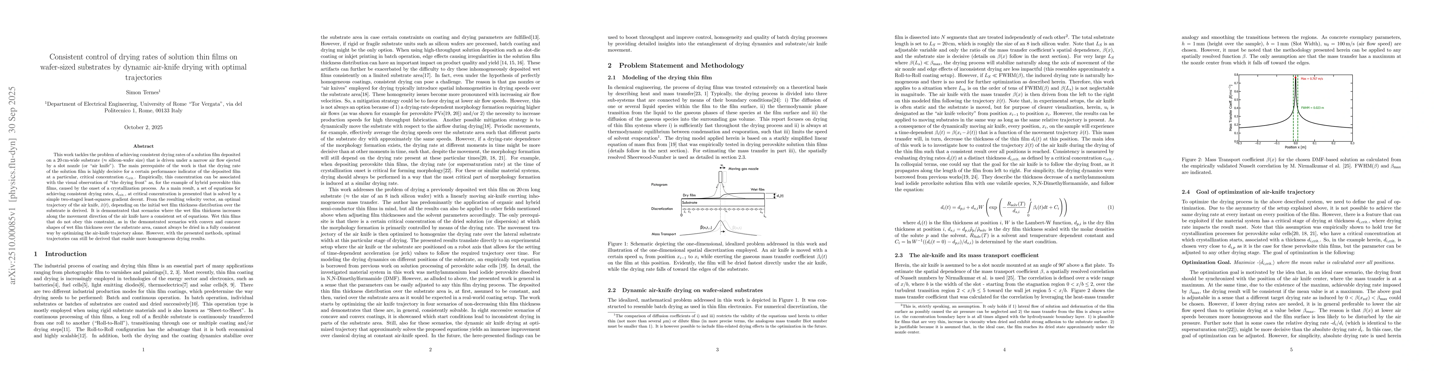 The research employs dynamic air-knife drying with optimal trajectory optimization to control drying rates of solution thin films on wafer-sized substrates. It uses a two-staged least-squares gradient descent method to solve equations for consistent drying rates at critical concentration, derived from spatial film thickness variations and air-knife movement dynamics.