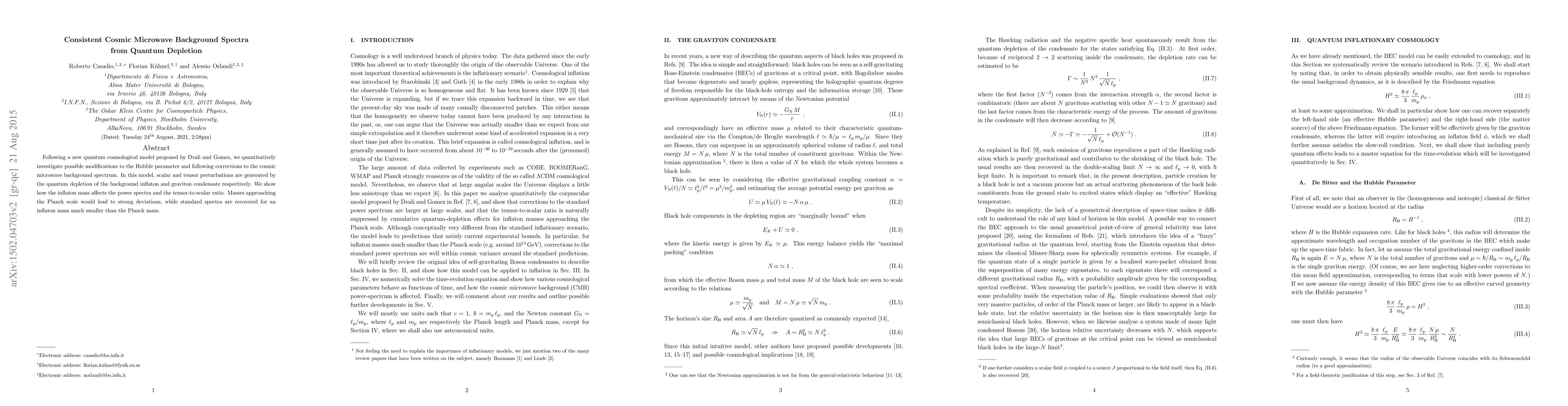 Following a new quantum cosmological model proposed by Dvali and Gomez, we quantitatively investigate possible modifications to the Hubble parameter and following corrections to the cosmic microwave background spectrum. In this model, scalar and tensor perturbations are generated by the quantum depletion of the background inflaton and graviton condensate respectively. We show how the inflaton mass affects the power spectra and the tensor-to-scalar ratio. Masses approaching the Planck scale would lead to strong deviations, while standard spectra are recovered for an inflaton mass much smaller than the Planck mass.