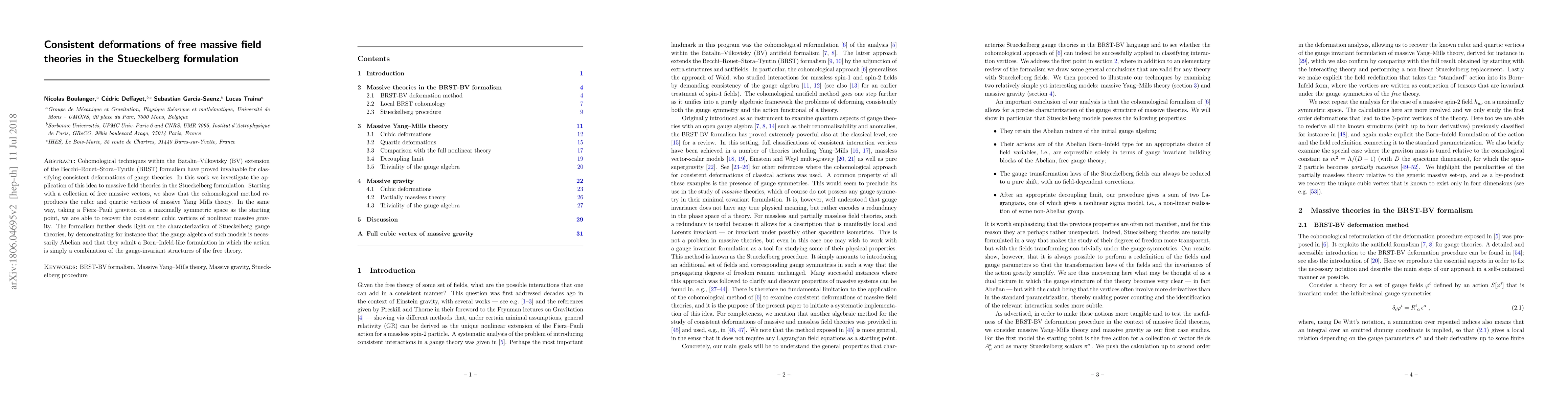 Cohomological techniques within the Batalin-Vilkovisky (BV) extension of the Becchi-Rouet-Stora-Tyutin (BRST) formalism have proved invaluable for classifying consistent deformations of gauge theories. In this work we investigate the application of this idea to massive field theories in the Stueckelberg formulation. Starting with a collection of free massive vectors, we show that the cohomological method reproduces the cubic and quartic vertices of massive Yang-Mills theory. In the same way, taking a Fierz-Pauli graviton on a maximally symmetric space as the starting point, we are able to recover the consistent cubic vertices of nonlinear massive gravity. The formalism further sheds light on the characterization of Stueckelberg gauge theories, by demonstrating for instance that the gauge algebra of such models is necessarily Abelian and that they admit a Born-Infeld-like formulation in which the action is simply a combination of the gauge-invariant structures of the free theory.