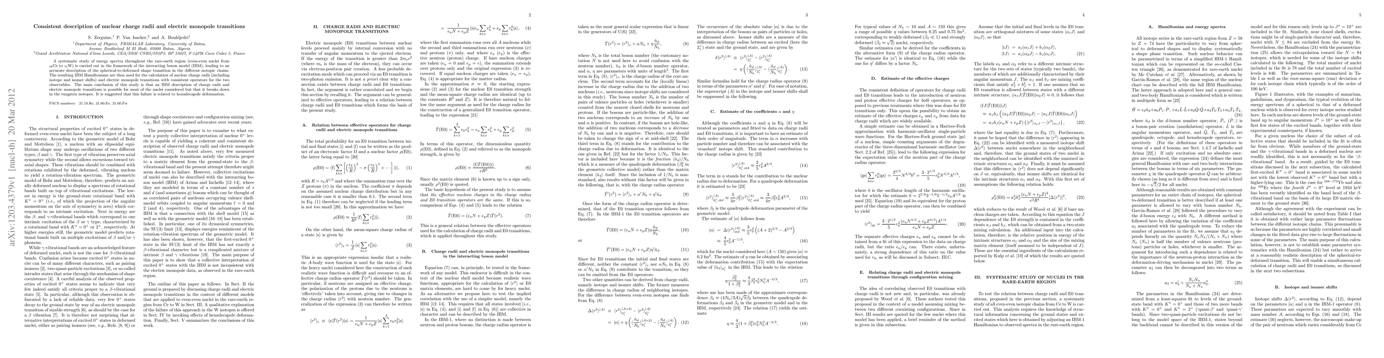 This study uses the interacting boson model to systematically describe energy spectra in rare-earth nuclei, successfully modeling the spherical-to-deformed shape transition. It calculates nuclear charge radii and electric monopole transitions, finding consistent results for most nuclei except for tungsten isotopes, where hexadecapole deformation is implicated.