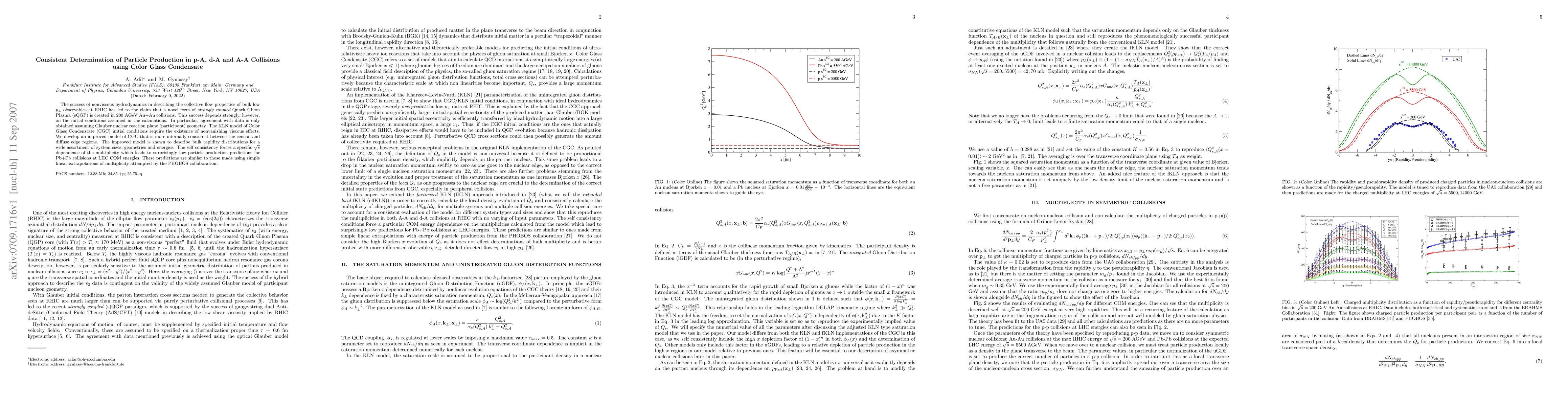 The success of nonviscous hydrodynamics in describing the collective flow properties of bulk low $p_\perp$ observables at RHIC has led to the claim that a novel form of {\it strongly coupled} Quark Gluon Plasma (sQGP) is created in 200 AGeV Au+Au collisions. This success depends strongly, however, on the initial conditions assumed in the calculations. In particular, agreement with data is only obtained assuming Glauber nuclear reaction plane (participant) geometry. The KLN model of Color Glass Condenstate (CGC) initial conditions require the existence of nonvanishing viscous effects. We develop an improved model of CGC that is more internally consistent between the central and diffuse edge regions. The improved model is shown to describe bulk rapidity distributions for a wide assortment of system sizes, geometries and energies. The self consistency forces a specific $\sqrt{s}$ dependence of the multiplicity which leads to surprisingly low particle production predictions for Pb+Pb collisions at LHC COM energies. These predictions are similar to those made using simple linear extrapolations of multiplicity attempted by the PHOBOS collaboration.