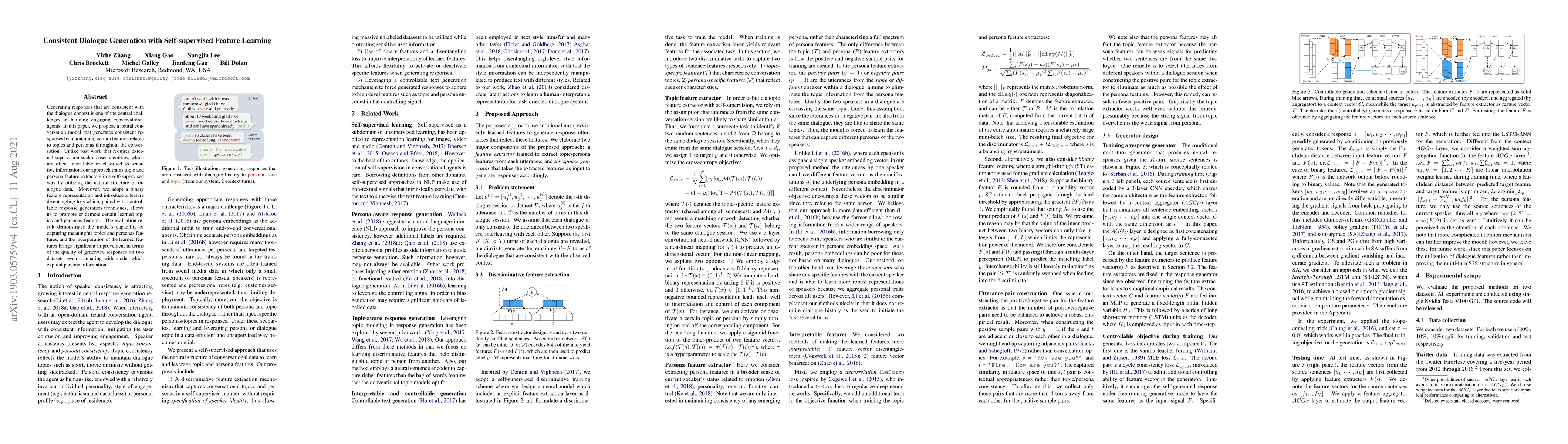 This paper proposes a self-supervised method for generating consistent dialogue responses by extracting and maintaining topic and persona features throughout conversations. The approach uses contrastive training and feature disentangling loss to learn these features without external supervision, leading to improved response quality on dialogue datasets.
