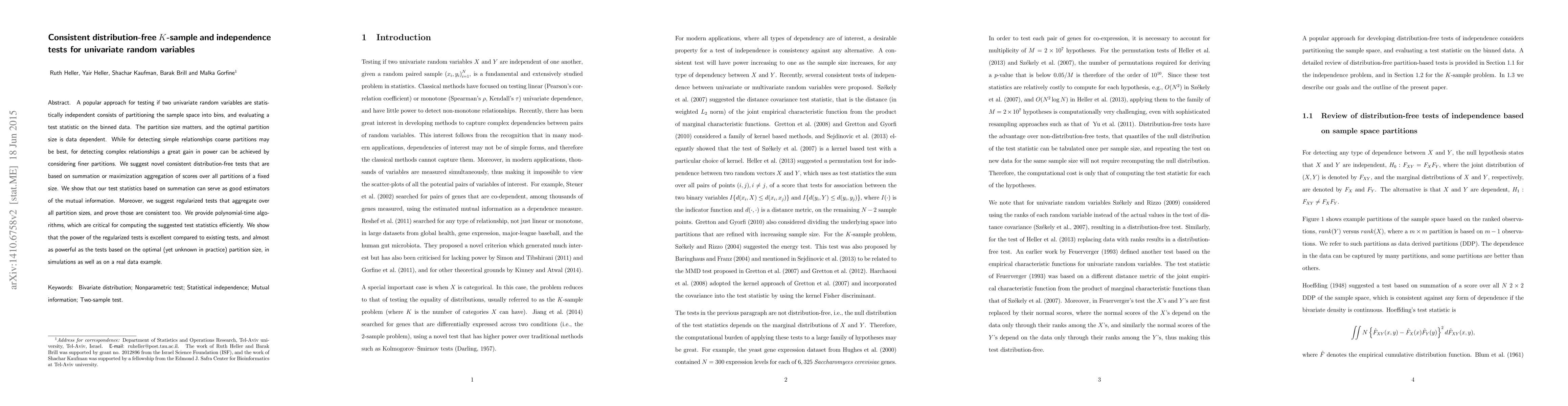 This research paper proposes novel tests for univariate random variables to determine statistical independence, offering consistent distribution-free methods that can detect both simple and complex relationships with high power.