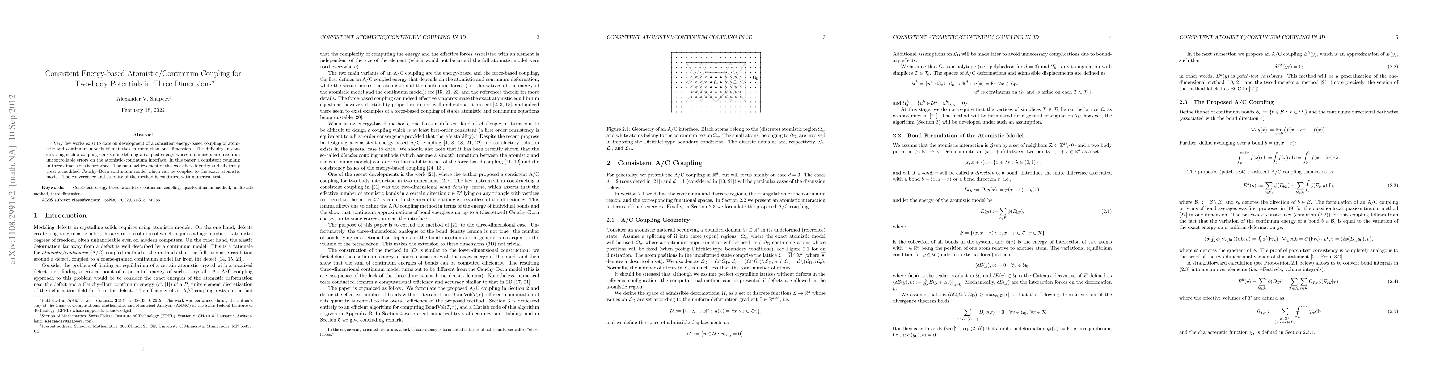This paper proposes a consistent energy-based coupling method for atomistic and continuum models in three dimensions, addressing the challenge of minimizing errors at the interface. It introduces a modified Cauchy-Born model for efficient coupling and validates the method's convergence and stability through numerical tests.