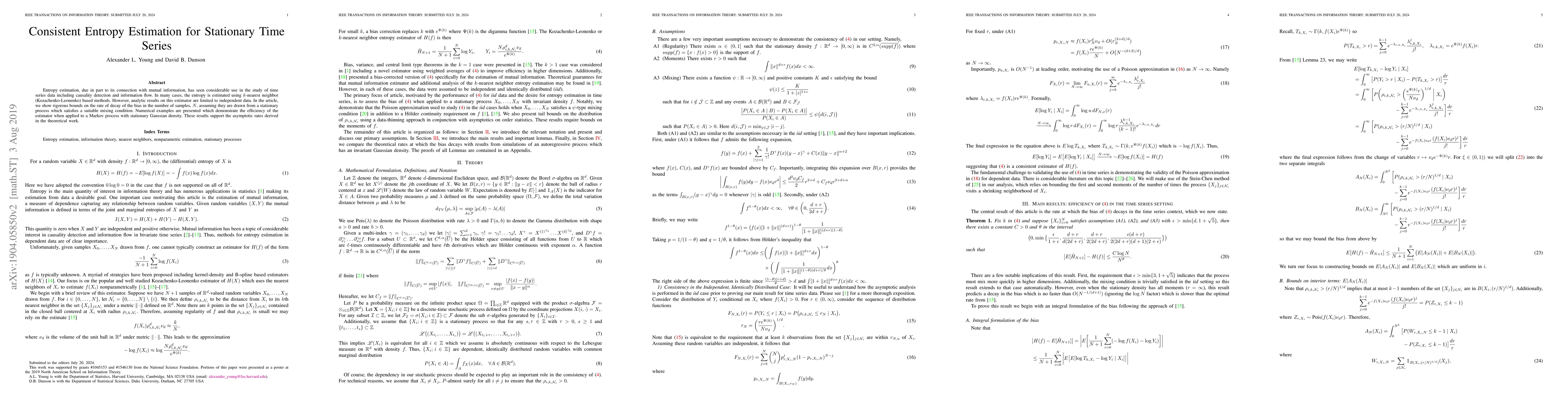 This paper provides rigorous bounds on the entropy estimation bias for stationary time series using $k$-nearest neighbor methods, extending analytic results beyond independent data. Numerical examples validate the estimator's efficiency on Markov processes with stationary Gaussian densities, supporting the theoretical findings.