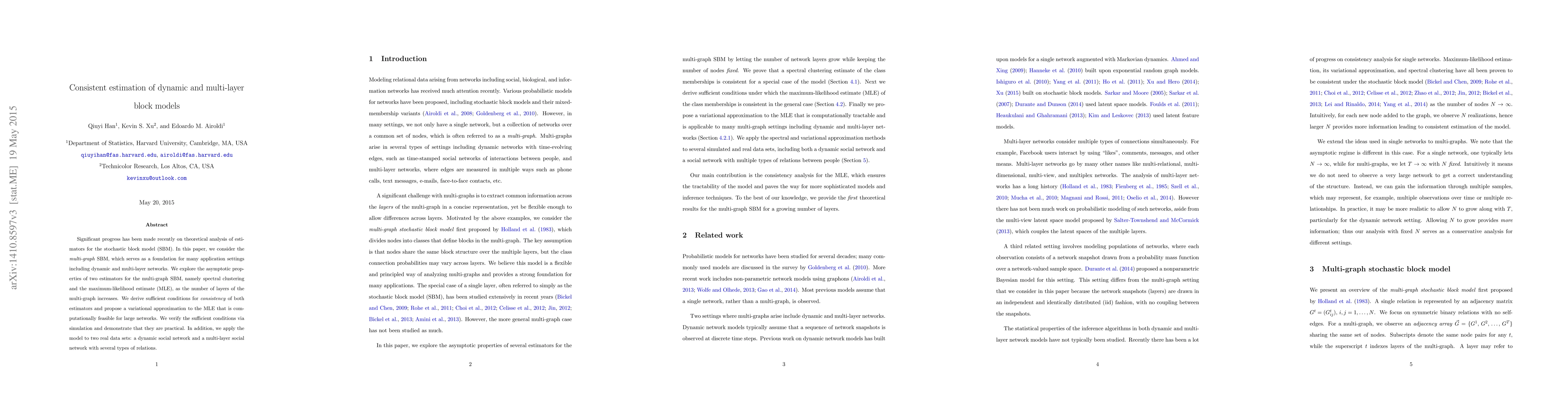 This paper investigates the asymptotic properties of estimators for the multi-graph stochastic block model, focusing on spectral clustering and the maximum-likelihood estimate. It provides sufficient conditions for consistency and proposes a computationally feasible variational approximation, validated through simulations and real-world applications to dynamic and multi-layer social networks.