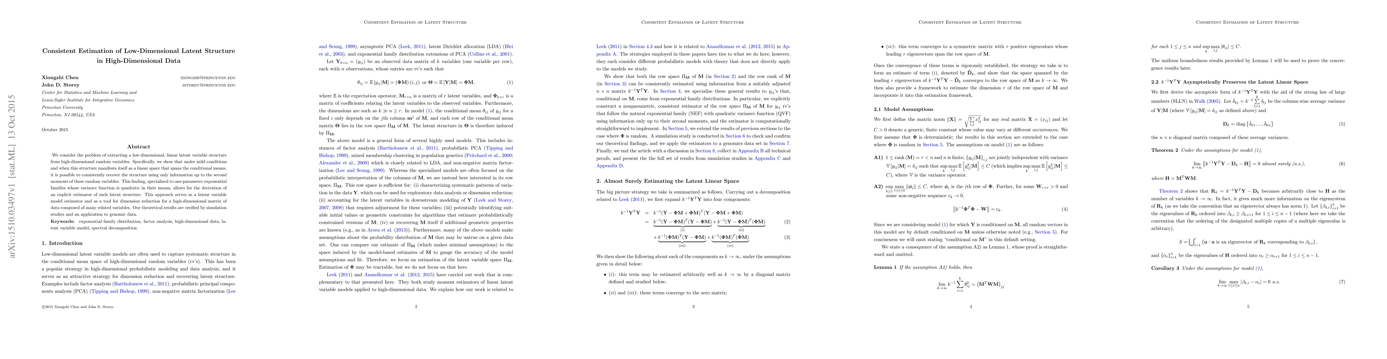 We consider the problem of extracting a low-dimensional, linear latent variable structure from high-dimensional random variables. Specifically, we show that under mild conditions and when this structure manifests itself as a linear space that spans the conditional means, it is possible to consistently recover the structure using only information up to the second moments of these random variables. This finding, specialized to one-parameter exponential families whose variance function is quadratic in their means, allows for the derivation of an explicit estimator of such latent structure. This approach serves as a latent variable model estimator and as a tool for dimension reduction for a high-dimensional matrix of data composed of many related variables. Our theoretical results are verified by simulation studies and an application to genomic data.