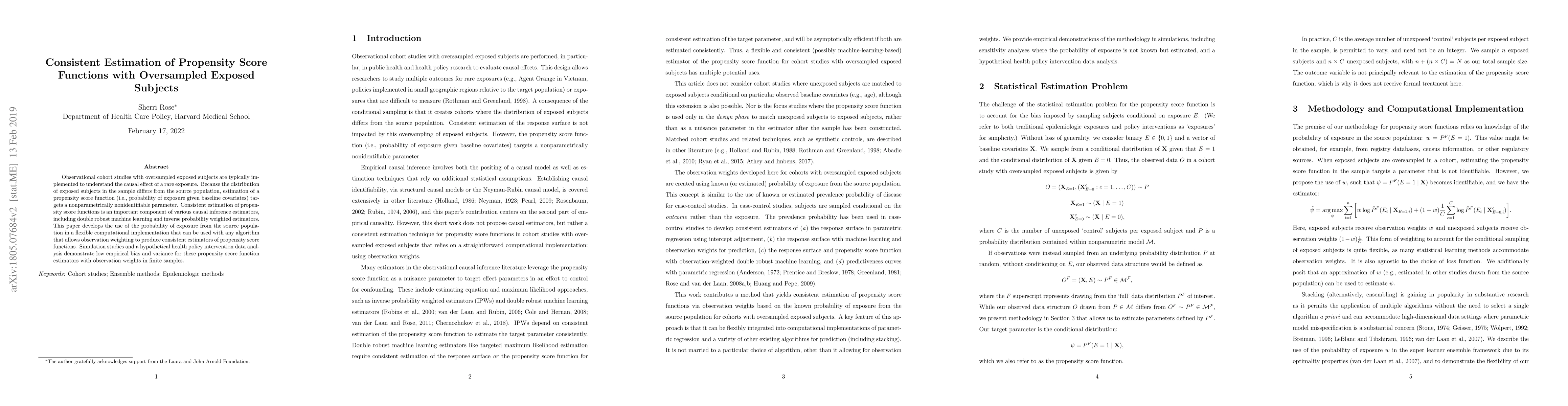 This paper proposes a method for consistent estimation of propensity score functions in observational studies with oversampled exposed subjects, utilizing the source population's exposure probability. The approach employs observation weighting in machine learning algorithms to achieve low bias and variance, as demonstrated through simulation studies and a hypothetical health policy analysis.