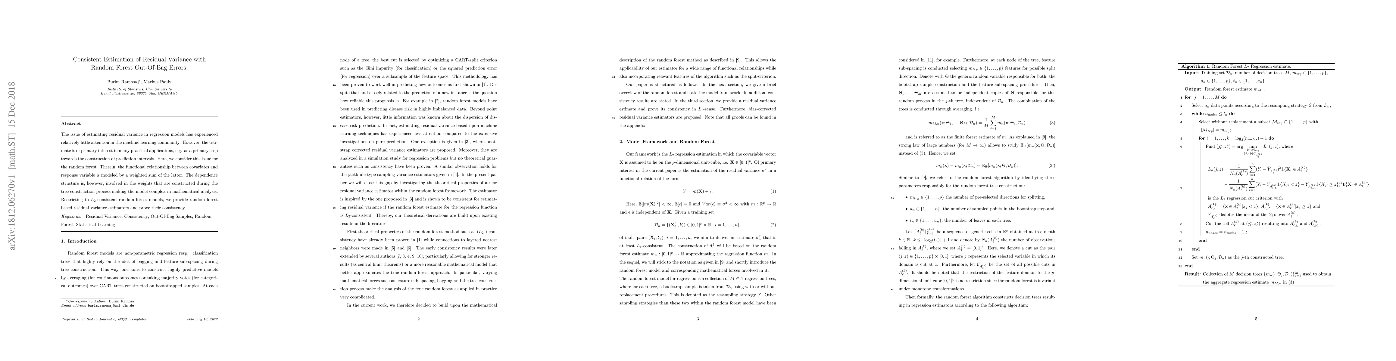 The issue of estimating residual variance in regression models has experienced relatively little attention in the machine learning community. However, the estimate is of primary interest in many practical applications, e.g. as a primary step towards the construction of prediction intervals. Here, we consider this issue for the random forest. Therein, the functional relationship between covariates and response variable is modeled by a weighted sum of the latter. The dependence structure is, however, involved in the weights that are constructed during the tree construction process making the model complex in mathematical analysis. Restricting to L2-consistent random forest models, we provide random forest based residual variance estimators and prove their consistency.