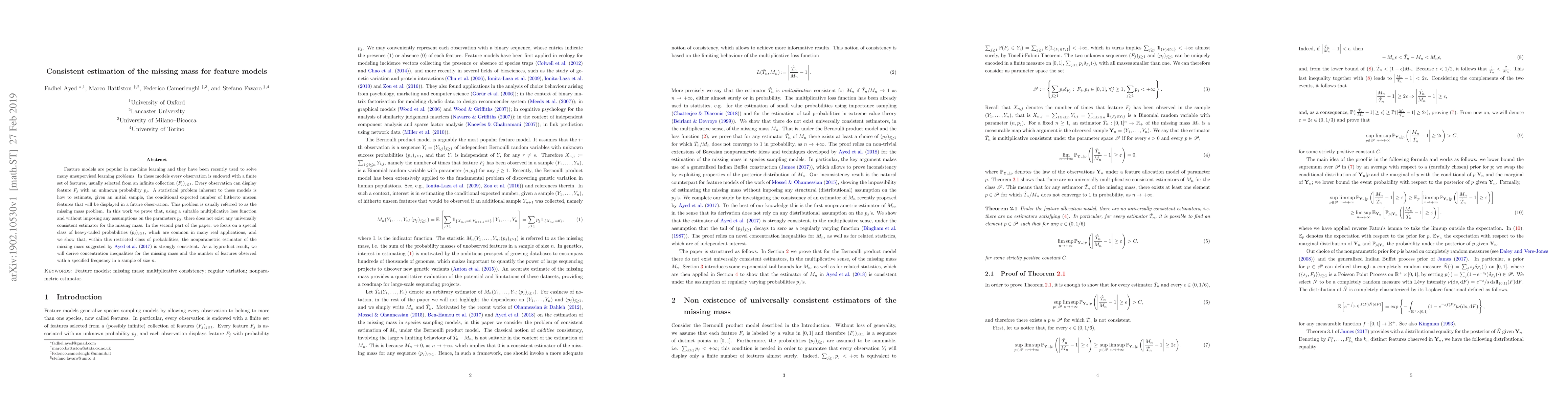 This paper demonstrates that no universally consistent estimator exists for the missing mass problem in feature models without assumptions on feature probabilities. It then proves that for a specific class of heavy-tailed probabilities, the nonparametric estimator proposed by Ayed et al. (2017) is strongly consistent, along with deriving concentration inequalities for the missing mass and observed features.