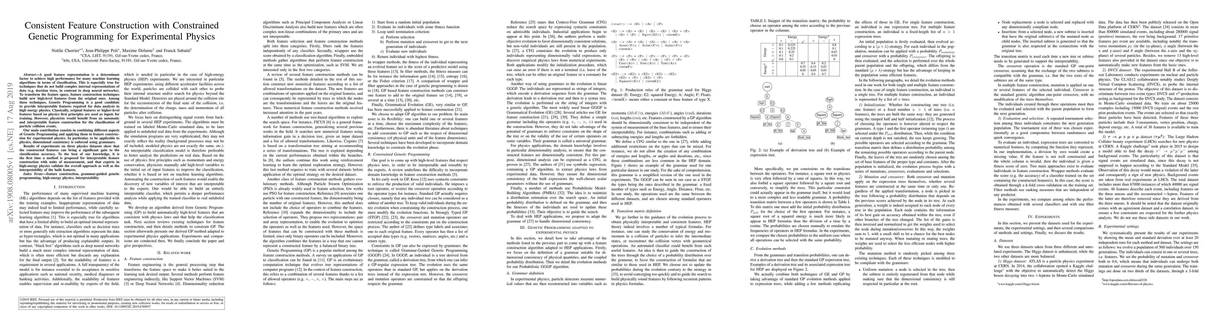 A new method for automatically creating interpretable features in particle collision event classification using Genetic Programming with dimensional consistency is proposed and shown to improve accuracy on three physics datasets.
