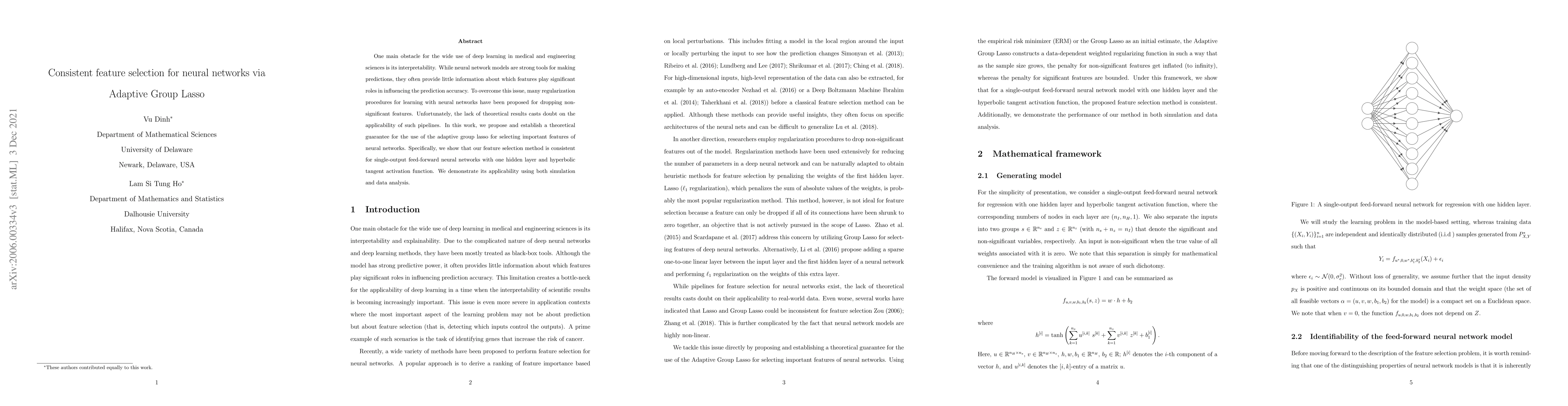 One main obstacle for the wide use of deep learning in medical and engineering sciences is its interpretability. While neural network models are strong tools for making predictions, they often provide little information about which features play significant roles in influencing the prediction accuracy. To overcome this issue, many regularization procedures for learning with neural networks have been proposed for dropping non-significant features. Unfortunately, the lack of theoretical results casts doubt on the applicability of such pipelines. In this work, we propose and establish a theoretical guarantee for the use of the adaptive group lasso for selecting important features of neural networks. Specifically, we show that our feature selection method is consistent for single-output feed-forward neural networks with one hidden layer and hyperbolic tangent activation function. We demonstrate its applicability using both simulation and data analysis.