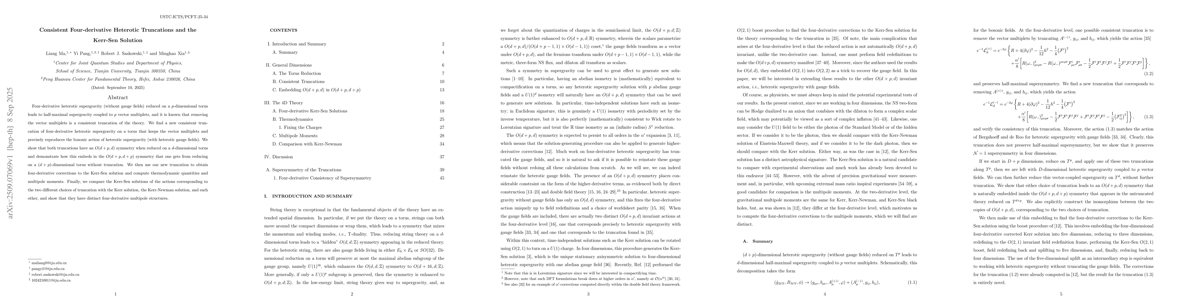 Four-derivative heterotic supergravity (without gauge fields) reduced on a $p$-dimensional torus leads to half-maximal supergravity coupled to $p$ vector multiplets, and it is known that removing the vector multiplets is a consistent truncation of the theory. We find a new consistent truncation of four-derivative heterotic supergravity on a torus that keeps the vector multiplets and precisely reproduces the bosonic action of heterotic supergravity (with heterotic gauge fields). We show that both truncations have an $O(d+p,d)$ symmetry when reduced on a $d$-dimensional torus and demonstrate how this embeds in the $O(d+p,d+p)$ symmetry that one gets from reducing on a $(d+p)$-dimensional torus without truncation. We then use our new truncation to obtain four-derivative corrections to the Kerr-Sen solution and compute thermodynamic quantities and multipole moments. Finally, we compare the Kerr-Sen solutions of the actions corresponding to the two different choices of truncation with the Kerr solution, the Kerr-Newman solution, and each other, and show that they have distinct four-derivative multipole structures.