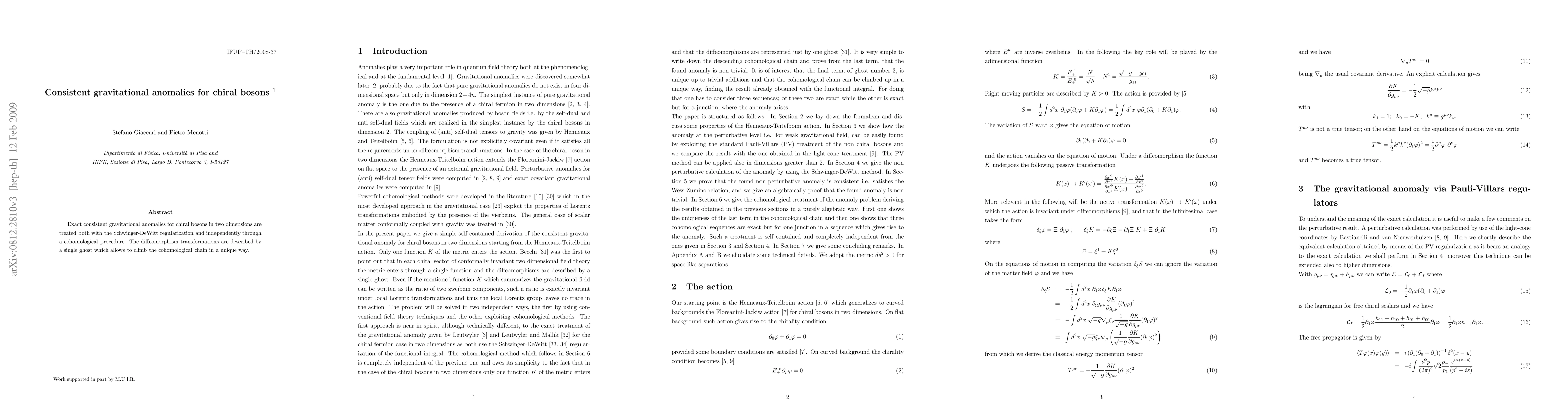 Researchers find consistent gravitational anomalies for chiral bosons in two dimensions using Schwinger-DeWitt regularization and a cohomological procedure, enabling unique calculations of diffeomorphism transformations.