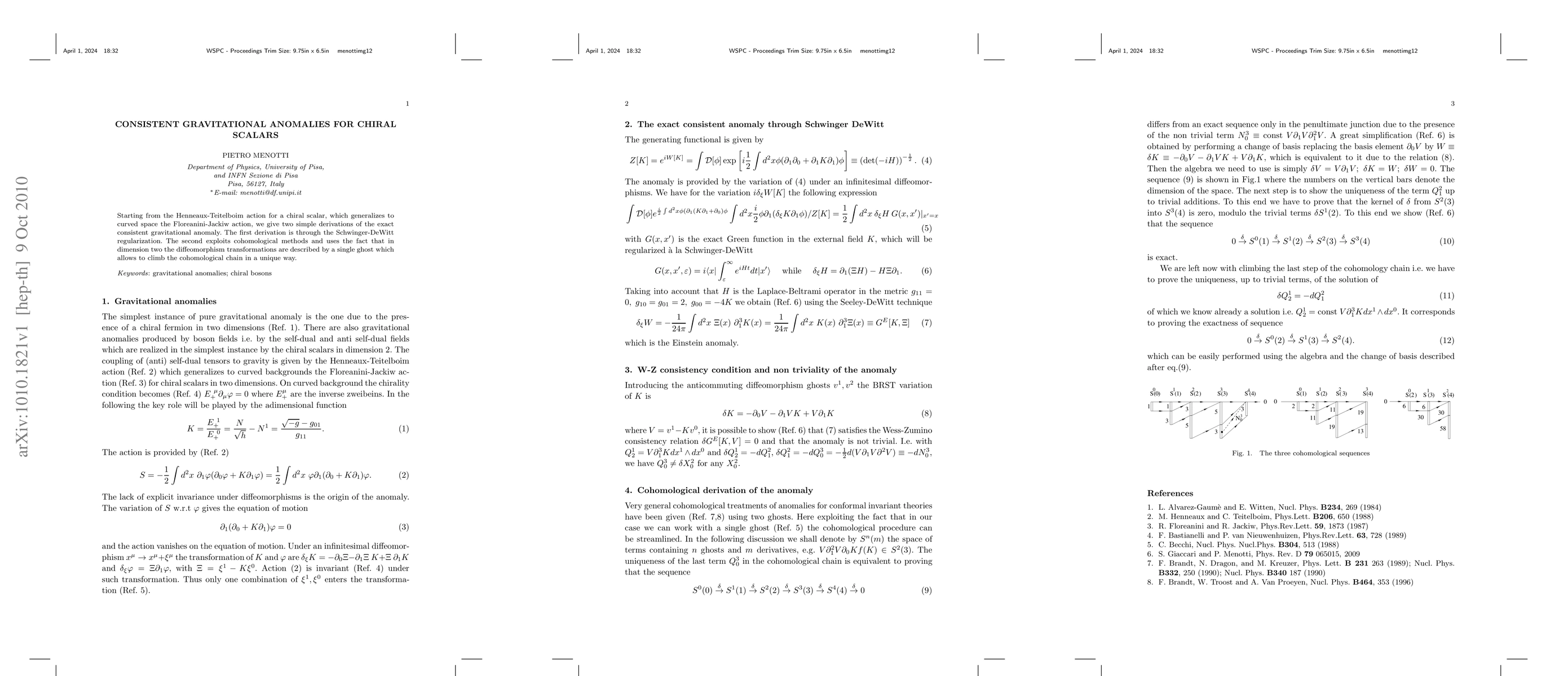 Researchers derive two methods to calculate consistent gravitational anomalies for chiral scalars, one using Schwinger-DeWitt regularization and the other leveraging cohomological methods in dimension two.