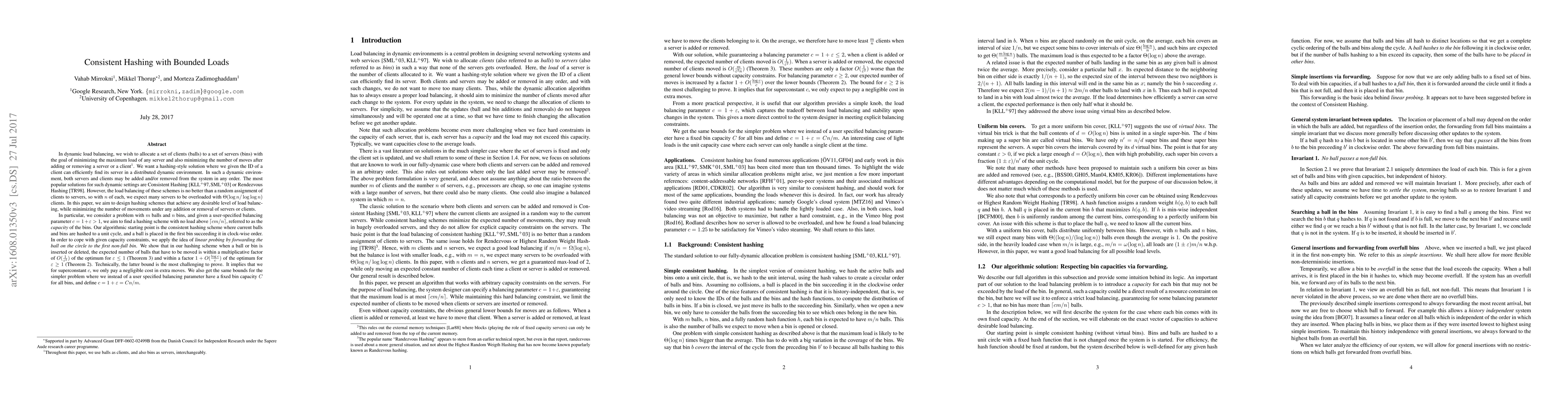 Designing algorithms for balanced allocation of clients to servers in dynamic settings is a challenging problem for a variety of reasons. Both servers and clients may be added and/or removed from the system periodically, and the main objectives of allocation algorithms are: the uniformity of the allocation, and the number of moves after adding or removing a server or a client. The most popular solution for our dynamic settings is Consistent Hashing. However, the load balancing of consistent hashing is no better than a random assignment of clients to servers, so with $n$ of each, we expect many servers to be overloaded with $\Theta(\log n/ \log\log n)$ clients. In this paper, with $n$ clients and $n$ servers, we get a guaranteed max-load of 2 while only moving an expected constant number of clients for each update. We take an arbitrary user specified balancing parameter $c=1+\epsilon>1$. With $m$ balls and $n$ bins in the system, we want no load above $\lceil cm/n\rceil$. Meanwhile we want to bound the expected number of balls that have to be moved when a ball or server is added or removed. Compared with general lower bounds without capacity constraints, we show that in our algorithm when a ball or bin is inserted or deleted, the expected number of balls that have to be moved is increased only by a multiplicative factor $O({1\over \epsilon^2})$ for $\epsilon \le 1$ (Theorem 4) and by a factor $1+O(\frac{\log c}c)$ for $\epsilon\ge 1$ (Theorem 3). Technically, the latter bound is the most challenging to prove. It implies that we for superconstant $c$ only pay a negligible cost in extra moves. We also get the same bounds for the simpler problem where we instead of a user specified balancing parameter have a fixed bin capacity $C$ for all bins.