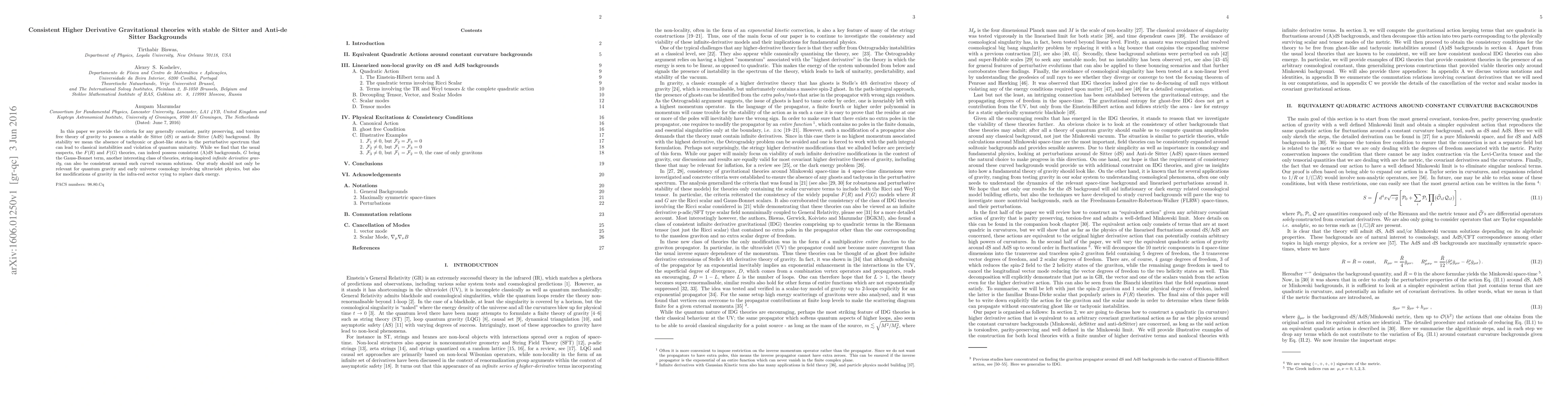 This paper establishes criteria for higher derivative gravitational theories to maintain stable de Sitter or anti-de Sitter backgrounds, ensuring no tachyonic instabilities. It finds that both F(R) and F(G) theories, as well as string-inspired infinite derivative gravity, can consistently support such backgrounds, with implications for quantum gravity and dark energy models.