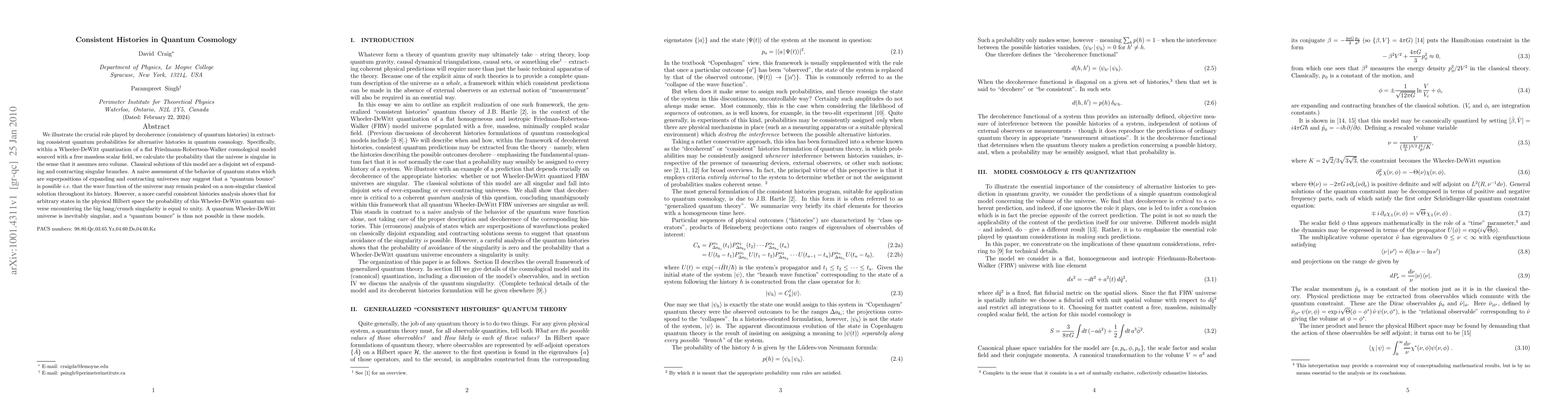 We illustrate the crucial role played by decoherence (consistency of quantum histories) in extracting consistent quantum probabilities for alternative histories in quantum cosmology. Specifically, within a Wheeler-DeWitt quantization of a flat Friedmann-Robertson-Walker cosmological model sourced with a free massless scalar field, we calculate the probability that the univese is singular in the sense that it assumes zero volume. Classical solutions of this model are a disjoint set of expanding and contracting singular branches. A naive assessment of the behavior of quantum states which are superpositions of expanding and contracting universes may suggest that a "quantum bounce" is possible i.e. that the wave function of the universe may remain peaked on a non-singular classical solution throughout its history. However, a more careful consistent histories analysis shows that for arbitrary states in the physical Hilbert space the probability of this Wheeler-DeWitt quantum universe encountering the big bang/crunch singularity is equal to unity. A quantum Wheeler-DeWitt universe is inevitably singular, and a "quantum bounce" is thus not possible in these models.