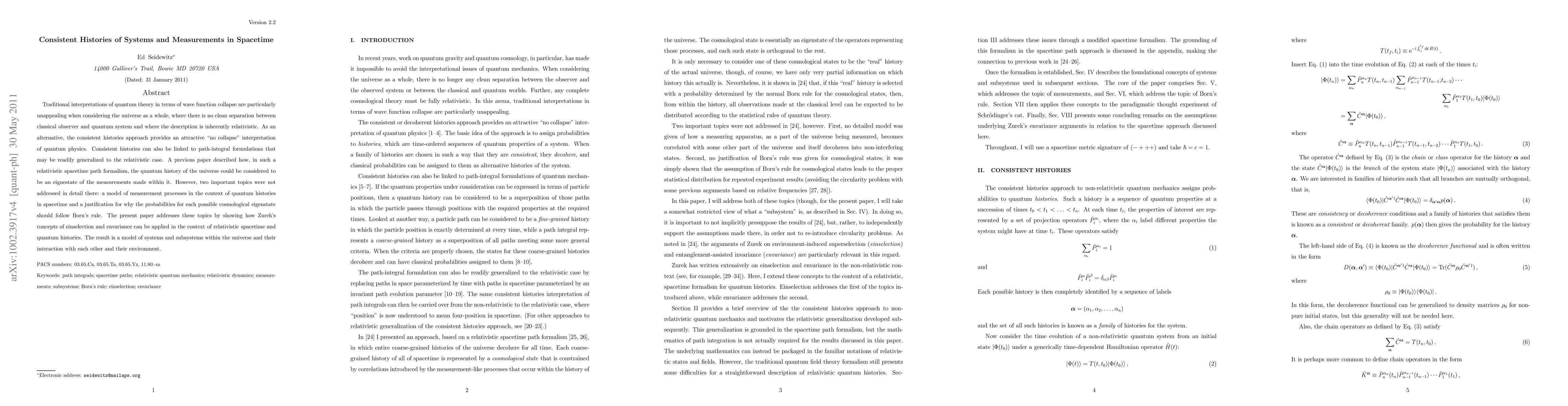 This paper explores the consistent histories approach to quantum theory, proposing a "no collapse" interpretation that is relativistically consistent. It develops a model for measurement processes in spacetime and justifies the use of Born's rule for probabilities in cosmological eigenstates, leveraging Zurek's concepts of einselection and envariance.