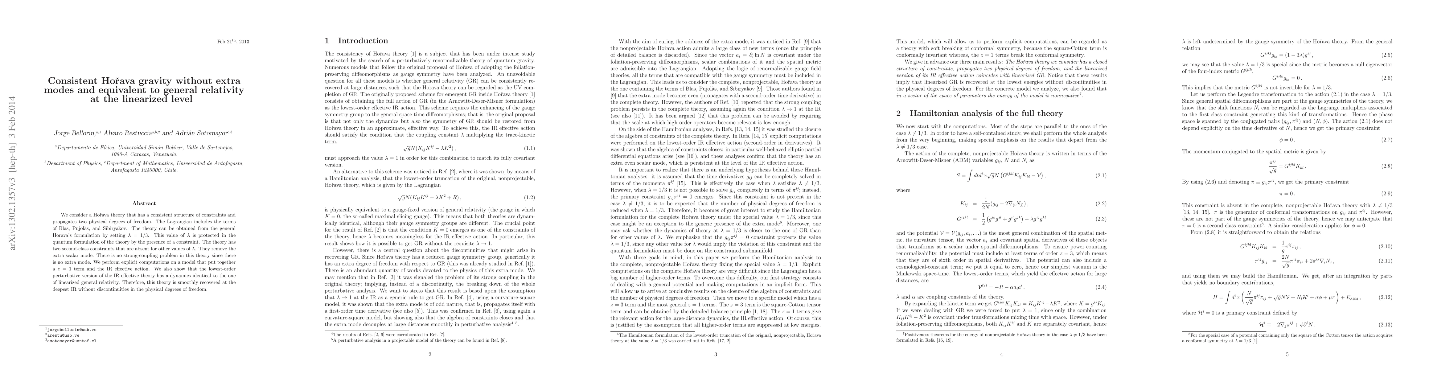 We consider a Horava theory that has a consistent structure of constraints and propagates two physical degrees of freedom. The Lagrangian includes the terms of Blas, Pujolas and Sibiryakov. The theory can be obtained from the general Horava's formulation by setting lambda = 1/3. This value of lambda is protected in the quantum formulation of the theory by the presence of a constraint. The theory has two second-class constraints that are absent for other values of lambda. They remove the extra scalar mode. There is no strong-coupling problem in this theory since there is no extra mode. We perform explicit computations on a model that put together a z = 1 term and the IR effective action. We also show that the lowest-order perturbative version of the IR effective theory has a dynamics identical to the one of linearized general relativity. Therefore, this theory is smoothly recovered at the deepest IR without discontinuities in the physical degrees of freedom.