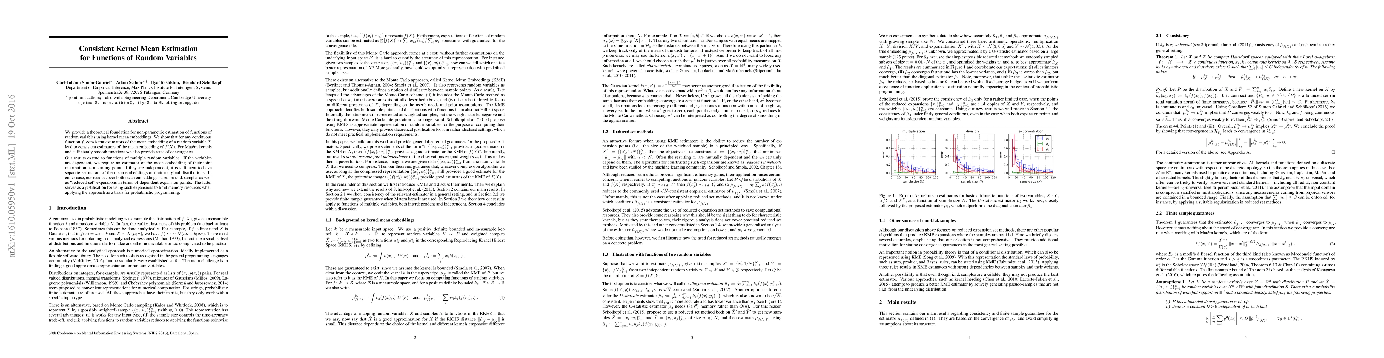 This paper establishes a theoretical framework for non-parametric estimation of functions of random variables via kernel mean embeddings, demonstrating consistent estimation for continuous functions. It also provides convergence rates for Matérn kernels and smooth functions, extending the results to dependent and independent multiple random variables.