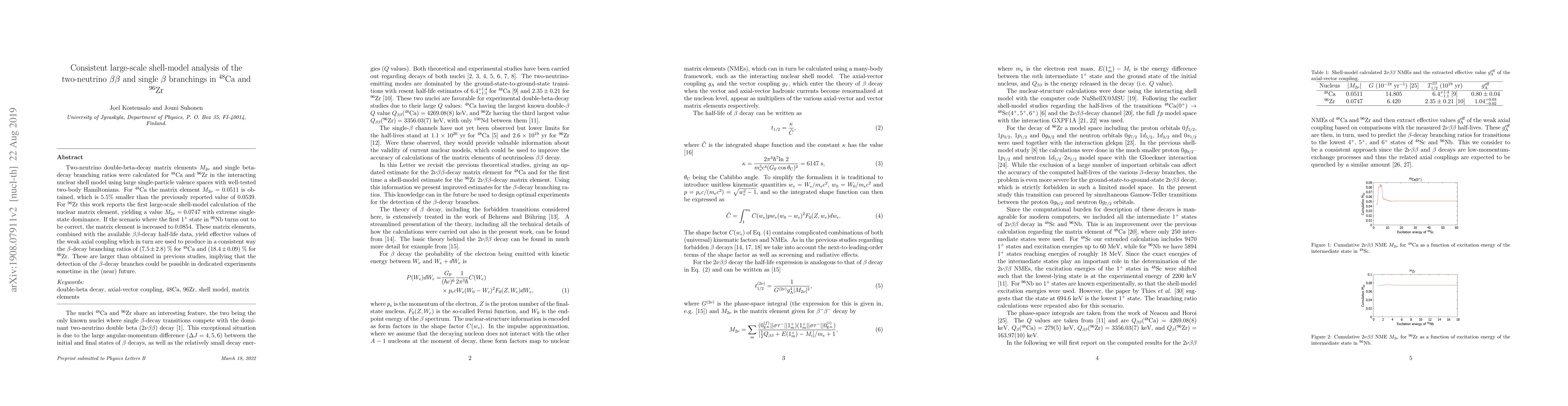 This paper reports large-scale shell-model calculations for the two-neutrino double-beta decay matrix elements and single beta decay branching ratios in $^{48}$Ca and $^{96}$Zr. The calculated matrix elements are $M_{2\nu}=0.0511$ for $^{48}$Ca and $M_{2\nu}=0.0747$ for $^{96}$Zr, with the latter potentially increasing to 0.0854 if a specific energy state is confirmed. The resulting beta decay branching ratios are $(7.5\pm2.8)$% for $^{48}$Ca and $(18.4\pm0.09)$% for $^{96}$Zr, suggesting possible future detection in experiments.