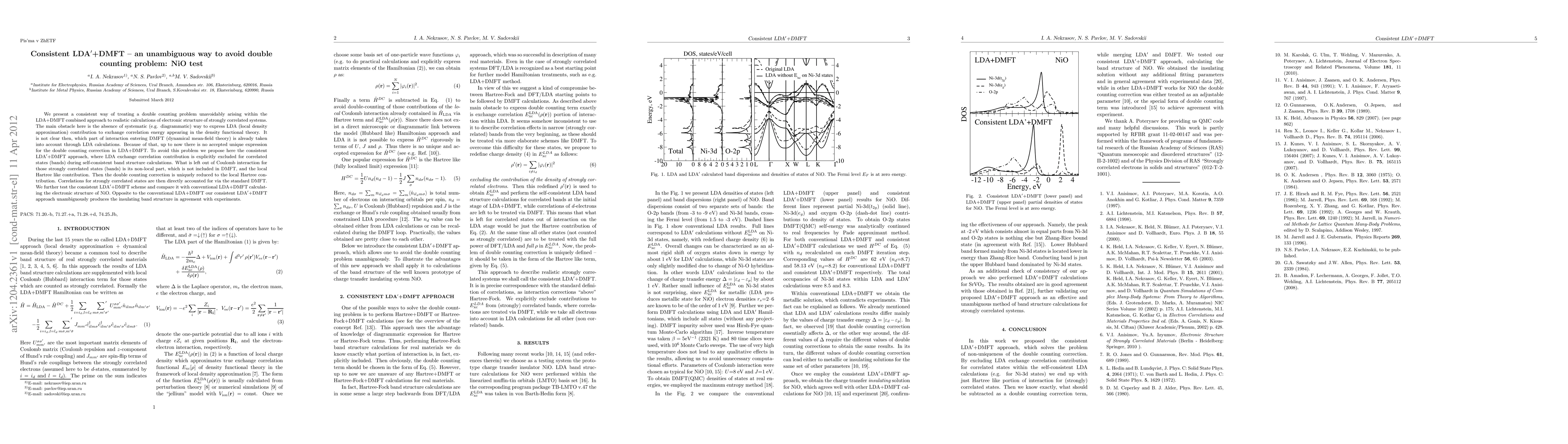 We present a consistent way of treating a double counting problem unavoidably arising within the LDA+DMFT combined approach to realistic calculations of electronic structure of strongly correlated systems. The main obstacle here is the absence of systematic (e.g. diagrammatic) way to express LDA (local density approximation) contribution to exchange correlation energy appearing in the density functional theory. It is not clear then, which part of interaction entering DMFT (dynamical mean-field theory) is already taken into account through LDA calculations. Because of that, up to now there is no accepted unique expression for the double counting correction in LDA+DMFT. To avoid this problem we propose here the consistent LDA'+DMFT approach, where LDA exchange correlation contribution is explicitly excluded for correlated states (bands) during self-consistent band structure calculations. What is left out of Coulomb interaction for those strongly correlated states (bands) is its non-local part, which is not included in DMFT, and the local Hartree like contribution. Then the double counting correction is uniquely reduced to the local Hartree contribution. Correlations for strongly correlated states are then directly accounted for via the standard DMFT. We further test the consistent LDA'+DMFT scheme and compare it with conventional LDA+DMFT calculating the electronic structure of NiO. Opposite to the conventional LDA+DMFT our consistent LDA'+DMFT approach unambiguously produces the insulating band structure in agreement with experiments.