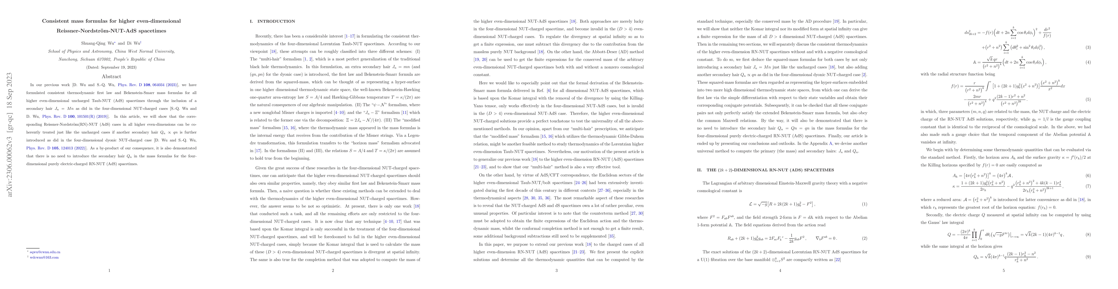 This paper extends consistent mass formulae to higher even-dimensional Reissner-Nordström-NUT-AdS spacetimes, introducing a secondary hair $Q_n$ proportional to charge $qn$ to treat dyonic cases analogously to uncharged scenarios. It also shows that $Q_n$ is unnecessary for mass formulae in four-dimensional purely electric-charged cases.