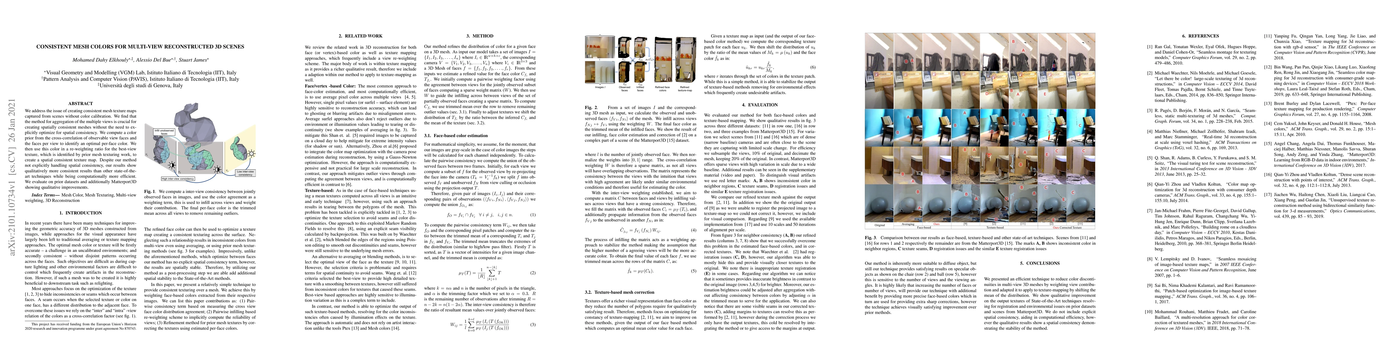 This research presents a method for creating consistent mesh color maps from multi-view 3D scene reconstructions without color calibration. It uses cross-correlation of view faces to compute a color prior and re-weights the best-view texture for spatial consistency, outperforming current techniques in consistency and efficiency.