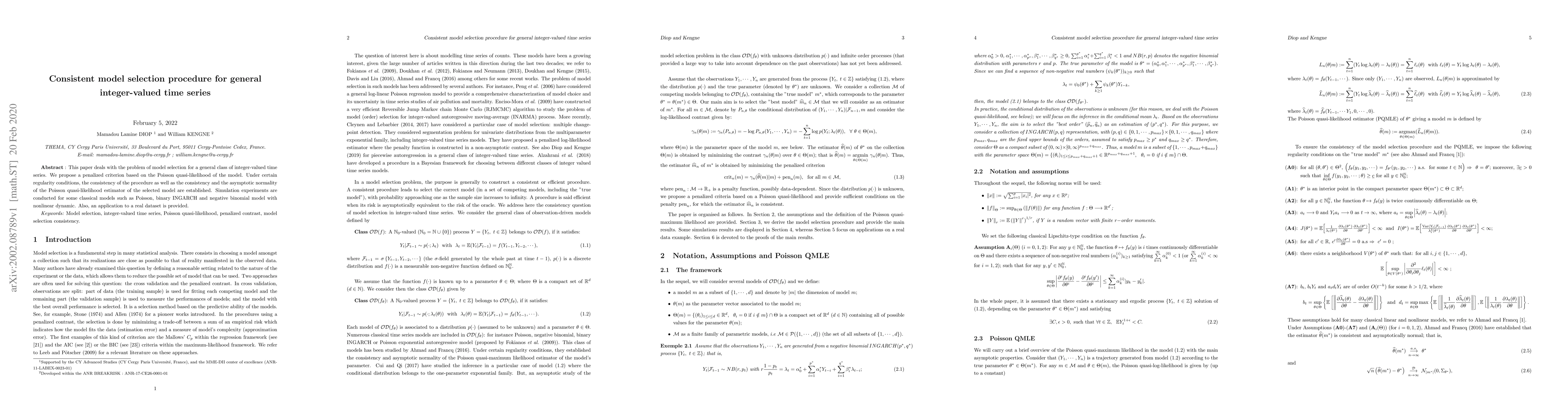 This paper proposes a penalized criterion for selecting models for general integer-valued time series based on Poisson quasi-likelihood, establishing its consistency and asymptotic normality under certain conditions. Simulation and real-data applications validate the method for classical models like Poisson, binary INGARCH, and negative binomial.