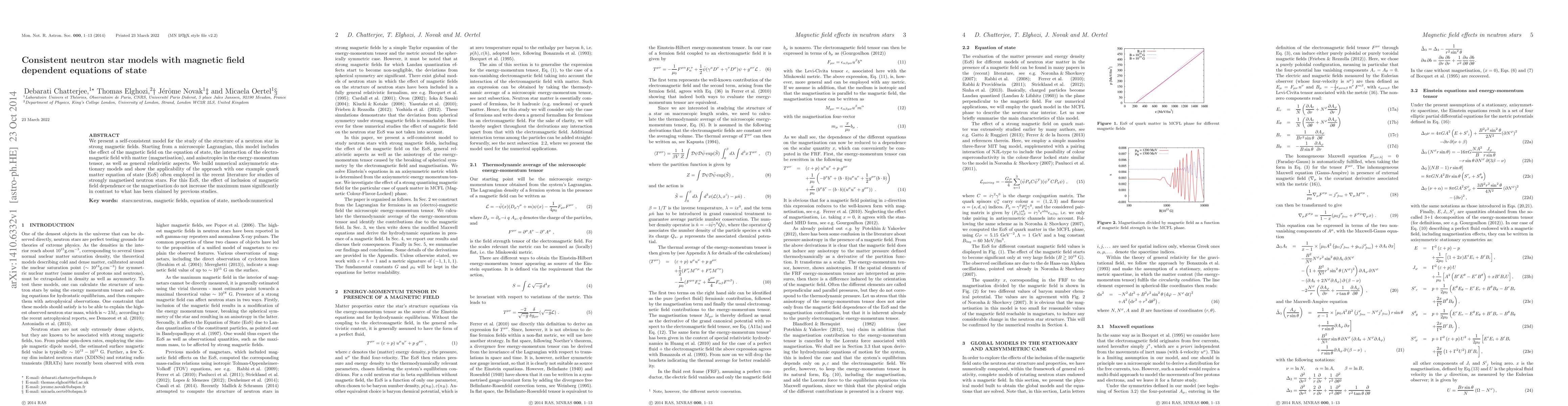 We present a self-consistent model for the study of the structure of a neutron star in strong magnetic fields. Starting from a microscopic Lagrangian, this model includes the effect of the magnetic field on the equation of state, the interaction of the electromagnetic field with matter (magnetisation), and anisotropies in the energy-momentum tensor, as well as general relativistic aspects. We build numerical axisymmetric stationary models and show the applicability of the approach with one example quark matter equation of state (EoS) often employed in the recent literature for studies of strongly magnetised neutron stars. For this EoS, the effect of inclusion of magnetic field dependence or the magnetisation do not increase the maximum mass significantly in contrast to what has been claimed by previous studies.