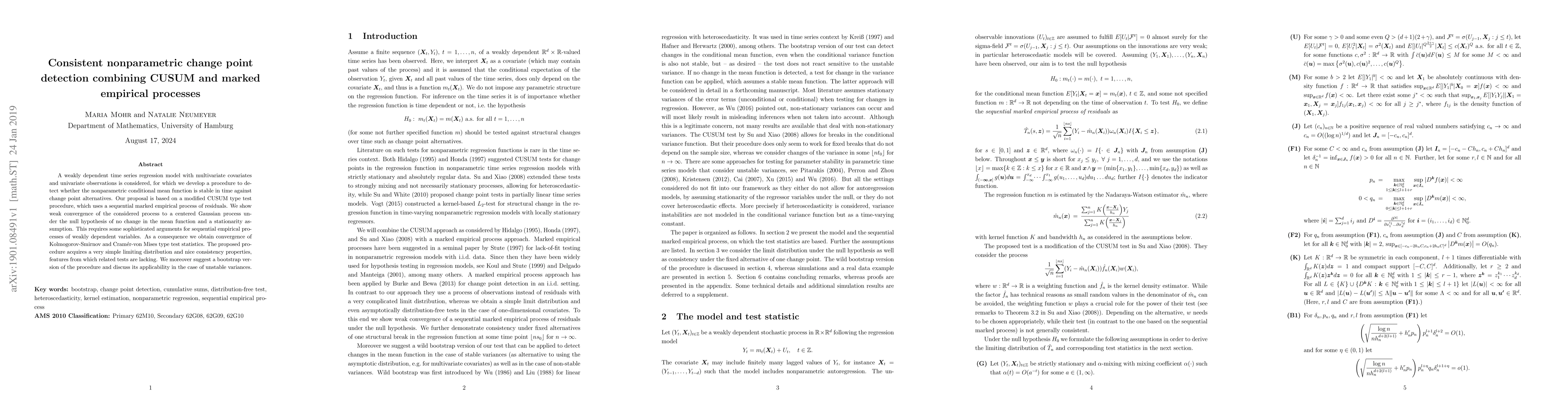 The paper presents a novel approach combining CUSUM statistics with marked empirical processes, establishing weak convergence and favorable limiting distributions for test statistics under both null and alternative hypotheses.