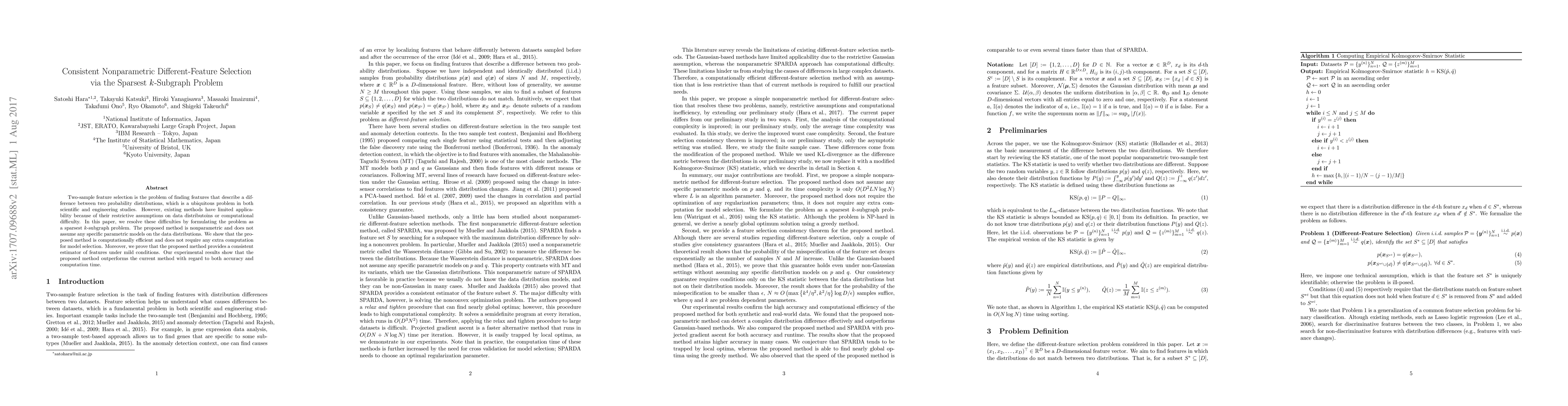 Two-sample feature selection is the problem of finding features that describe a difference between two probability distributions, which is a ubiquitous problem in both scientific and engineering studies. However, existing methods have limited applicability because of their restrictive assumptions on data distributoins or computational difficulty. In this paper, we resolve these difficulties by formulating the problem as a sparsest $k$-subgraph problem. The proposed method is nonparametric and does not assume any specific parametric models on the data distributions. We show that the proposed method is computationally efficient and does not require any extra computation for model selection. Moreover, we prove that the proposed method provides a consistent estimator of features under mild conditions. Our experimental results show that the proposed method outperforms the current method with regard to both accuracy and computation time.