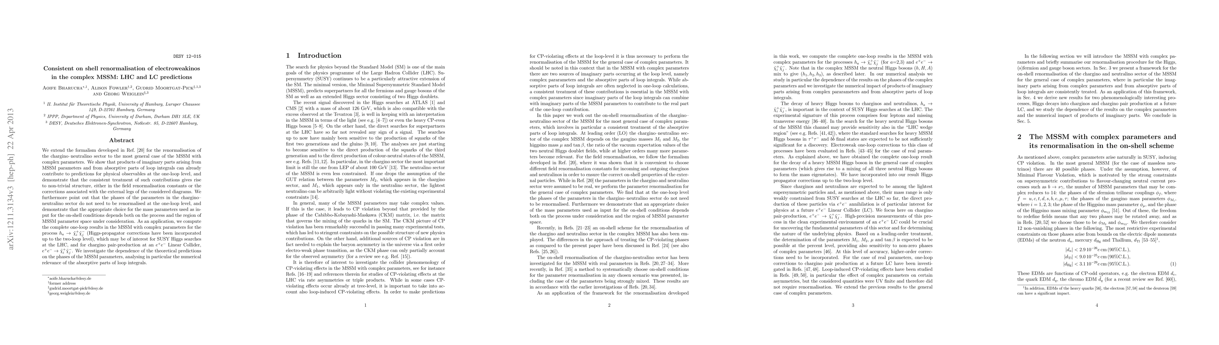 This paper extends the renormalisation formalism for the MSSM chargino-neutralino sector to include complex parameters, showing that imaginary contributions can affect one-loop predictions. It highlights the non-trivial structure arising from these contributions and discusses the implications for LHC and LC predictions in SUSY Higgs searches and chargino pair production.