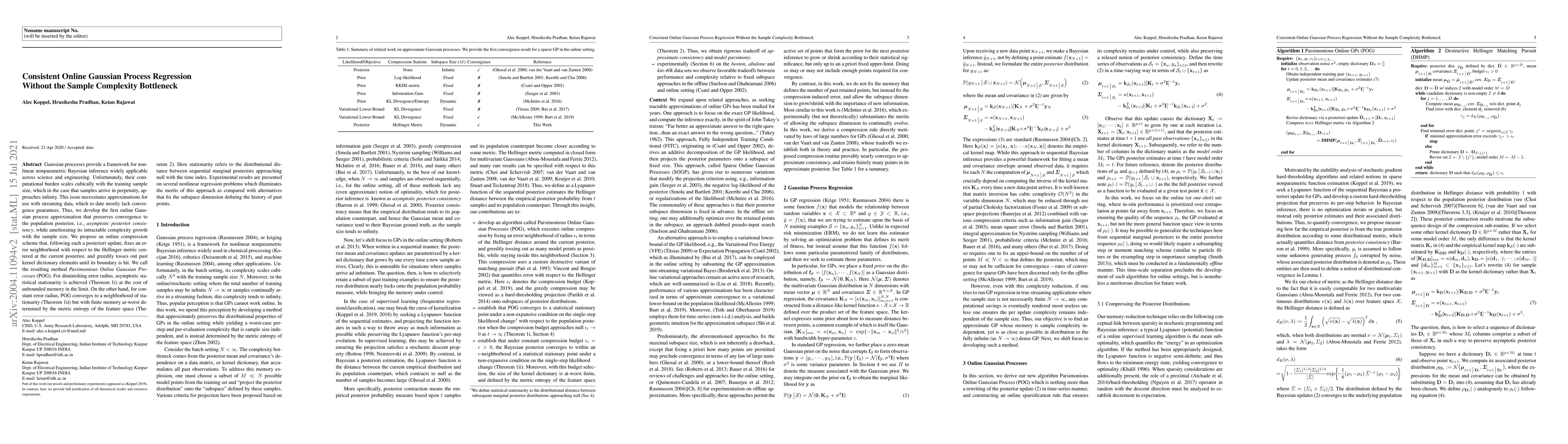 This paper introduces Parsimonious Online Gaussian Processes (POG), an online approximation method for Gaussian Process Regression that preserves convergence to the population posterior while reducing computational complexity. POG achieves asymptotic consistency with a diminishing error radius and finite memory for constant error radius.