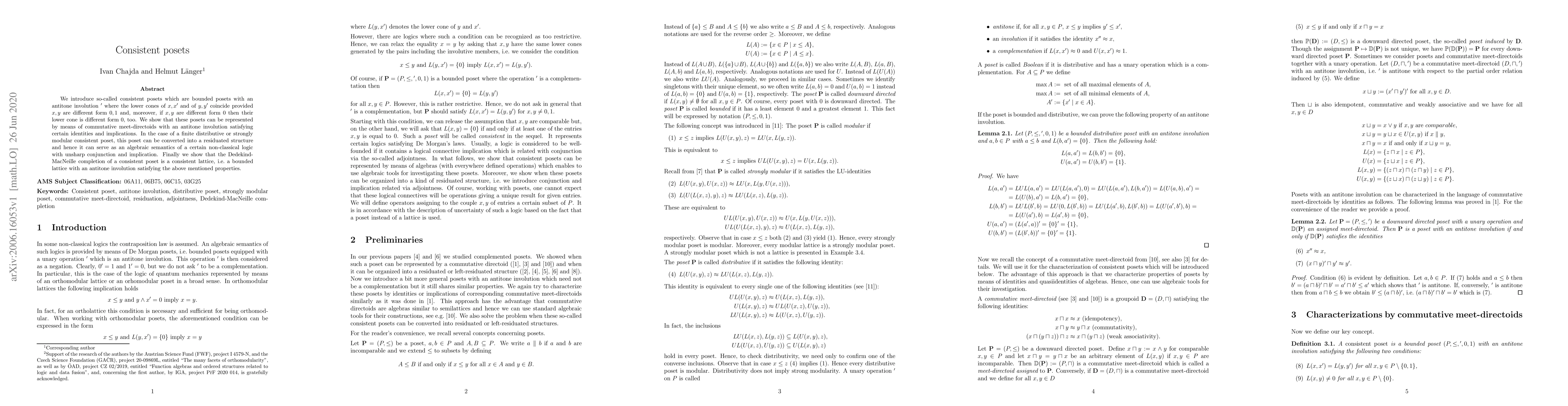 We introduce so-called consistent posets which are bounded posets with an antitone involution ' where the lower cones of x,x' and of y,y' coincide provided x,y are different form 0,1 and, moreover, if x,y are different form 0 then their lower cone is different form 0, too. We show that these posets can be represented by means of commutative meet-directoids with an antitone involution satisfying certain identities and implications. In the case of a finite distributive or strongly modular consistent poset, this poset can be converted into a residuated structure and hence it can serve as an algebraic semantics of a certain non-classical logic with unsharp conjunction and implication. Finally we show that the Dedekind-MacNeille completion of a consistent poset is a consistent lattice, i.e. a bounded lattice with an antitone involution satisfying the above mentioned properties.