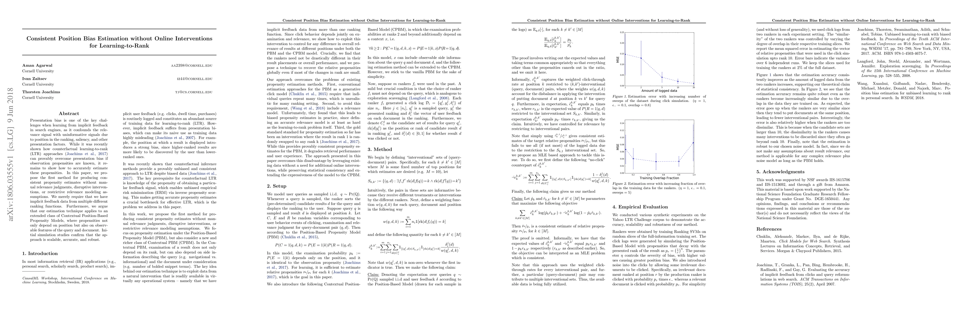 Presentation bias is one of the key challenges when learning from implicit feedback in search engines, as it confounds the relevance signal with uninformative signals due to position in the ranking, saliency, and other presentation factors. While it was recently shown how counterfactual learning-to-rank (LTR) approaches \cite{Joachims/etal/17a} can provably overcome presentation bias if observation propensities are known, it remains to show how to accurately estimate these propensities. In this paper, we propose the first method for producing consistent propensity estimates without manual relevance judgments, disruptive interventions, or restrictive relevance modeling assumptions. We merely require that we have implicit feedback data from multiple different ranking functions. Furthermore, we argue that our estimation technique applies to an extended class of Contextual Position-Based Propensity Models, where propensities not only depend on position but also on observable features of the query and document. Initial simulation studies confirm that the approach is scalable, accurate, and robust.
