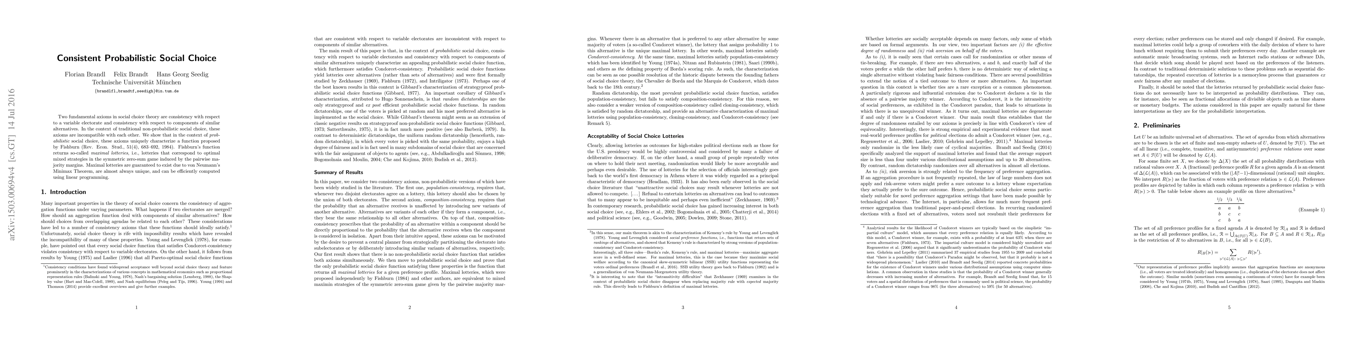 This paper demonstrates that probabilistic social choice theory reconciles two fundamental axioms—consistency with a variable electorate and consistency with components of similar alternatives—that are incompatible in traditional non-probabilistic social choice. It uniquely characterizes Fishburn's function, which computes maximal lotteries corresponding to optimal mixed strategies in plurality games, efficiently using linear programming.