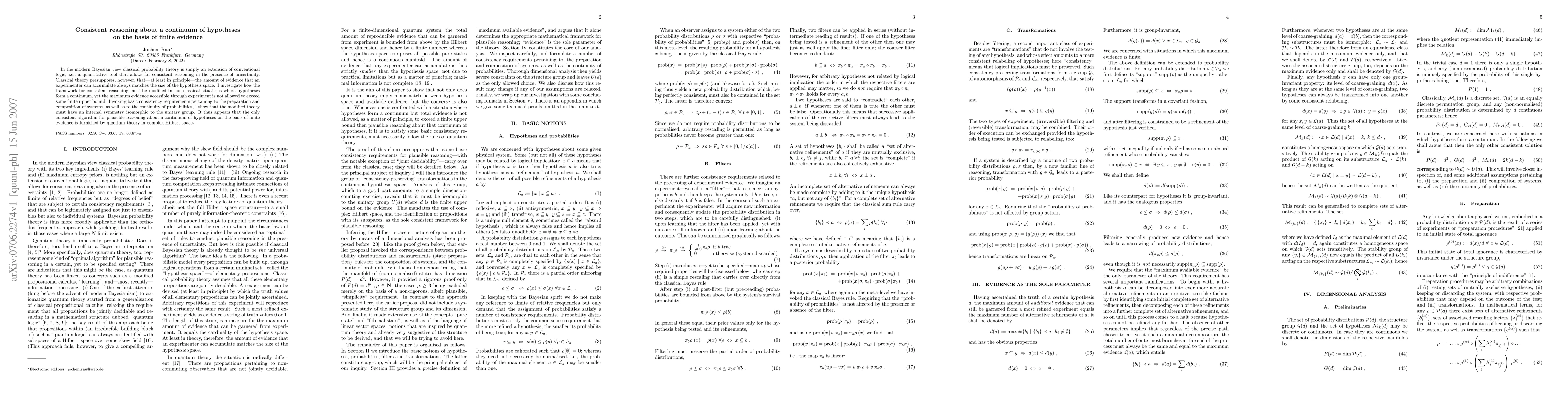 In the modern Bayesian view classical probability theory is simply an extension of conventional logic, i.e., a quantitative tool that allows for consistent reasoning in the presence of uncertainty. Classical theory presupposes, however, that--at least in principle--the amount of evidence that an experimenter can accumulate always matches the size of the hypothesis space. I investigate how the framework for consistent reasoning must be modified in non-classical situations where hypotheses form a continuum, yet the maximum evidence accessible through experiment is not allowed to exceed some finite upper bound. Invoking basic consistency requirements pertaining to the preparation and composition of systems, as well as to the continuity of probabilities, I show that the modified theory must have an internal symmetry isomorphic to the unitary group. It thus appears that the only consistent algorithm for plausible reasoning about a continuum of hypotheses on the basis of finite evidence is furnished by quantum theory in complex Hilbert space.