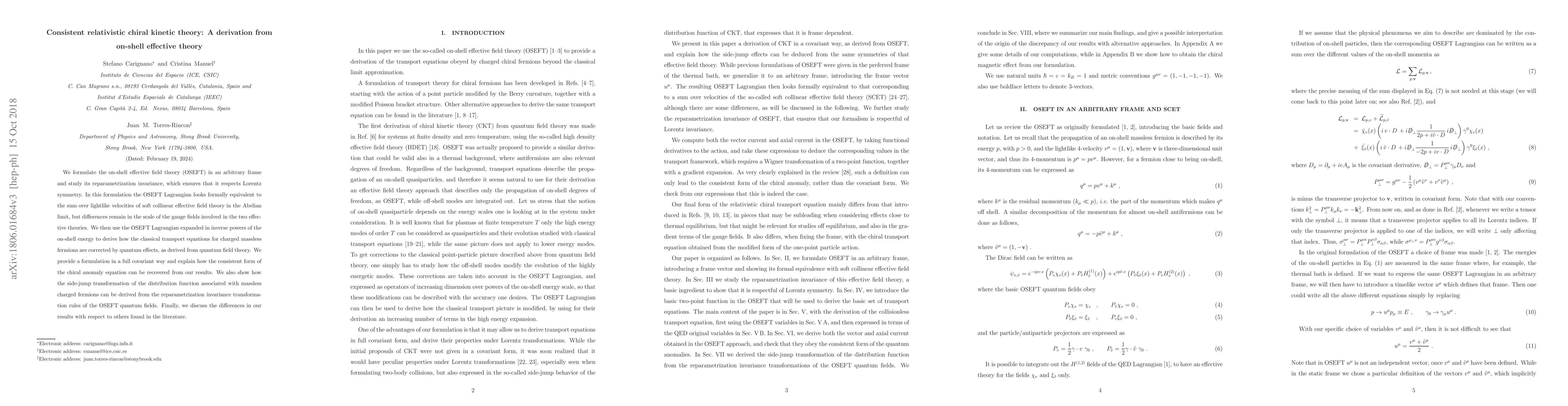 We formulate the on-shell effective field theory (OSEFT) in an arbitrary frame and study its reparametrization invariance (RI), which ensures that it is respectful of Lorentz symmetry. In this formulation the OSEFT Lagrangian looks formally equivalent to the sum over light-like velocities of soft collinear effective field theory in the Abelian limit, differences remain in the scale of the gauge fields involved in the two effective theories. We then use the OSEFT Lagrangian expanded in powers of the on-shell energy to derive how the classical transport equations for charged massless fermions are corrected by quantum effects, as derived from quantum field theory. We provide a formulation in a full covariant way, and explain how the consistent form of the chiral anomaly equation can be recovered from our results. We also show how the side jump transformation of the distribution function associated with massless charged fermions can be derived from the RI transformation rules of the OSEFT quantum fields. Finally, we discuss differences in our results with others found in the literature.