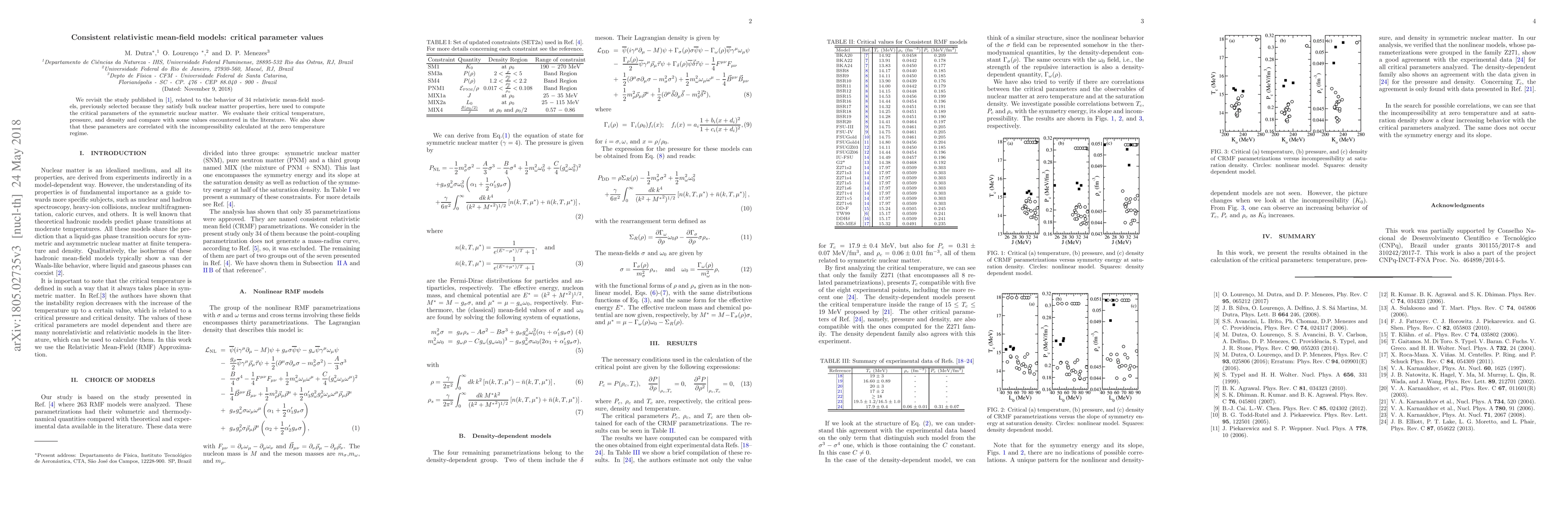 We revisit the study published in [1], related to the behavior of 34 relativistic mean-field models, previously selected because they satisfy bulk nuclear matter properties, here used to compute the critical parameters of the symmetric nuclear matter. We evaluate their critical temperature, pressure, and density and compare with some values encountered in the literature. We also show that these parameters are correlated with the incompressibility calculated at the zero temperature regime.