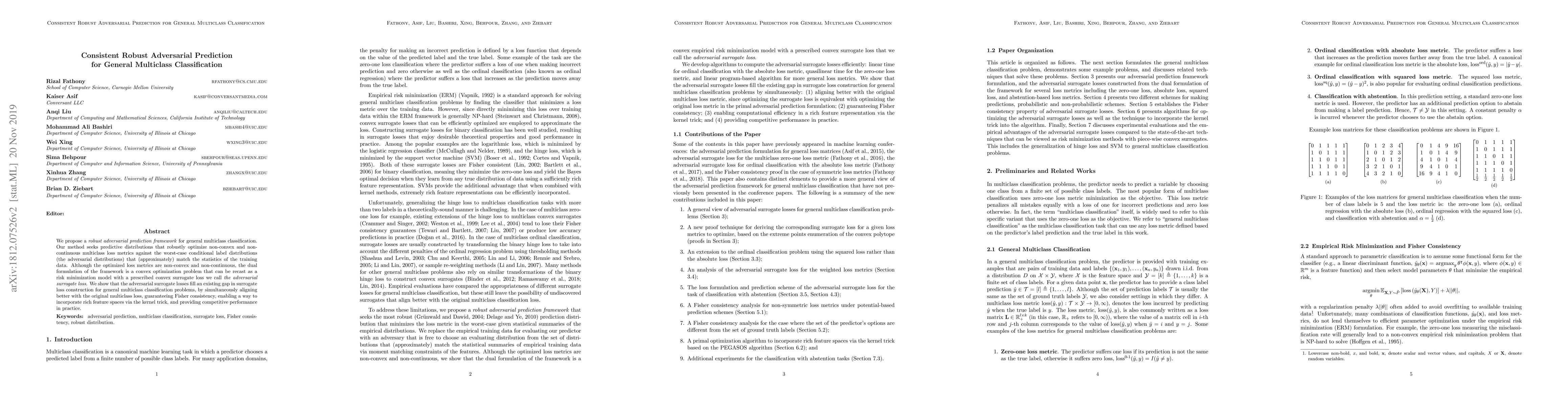 The paper proposes a robust adversarial prediction framework for general multiclass classification, optimizing non-convex and non-continuous loss metrics against worst-case conditional label distributions, recast as a convex optimization problem with a novel adversarial surrogate loss.