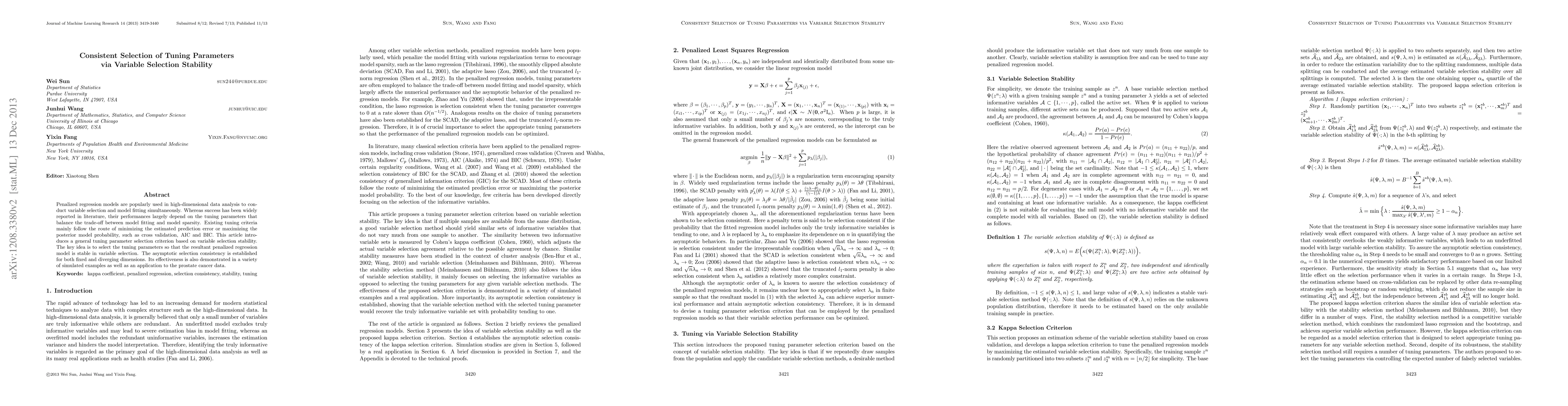 This paper proposes a new tuning parameter selection criterion for penalized regression models based on variable selection stability, ensuring consistent selection of variables across different tuning parameters. The method is shown to be asymptotically consistent in both fixed and high-dimensional settings, and its effectiveness is validated through simulations and an application to prostate cancer data.