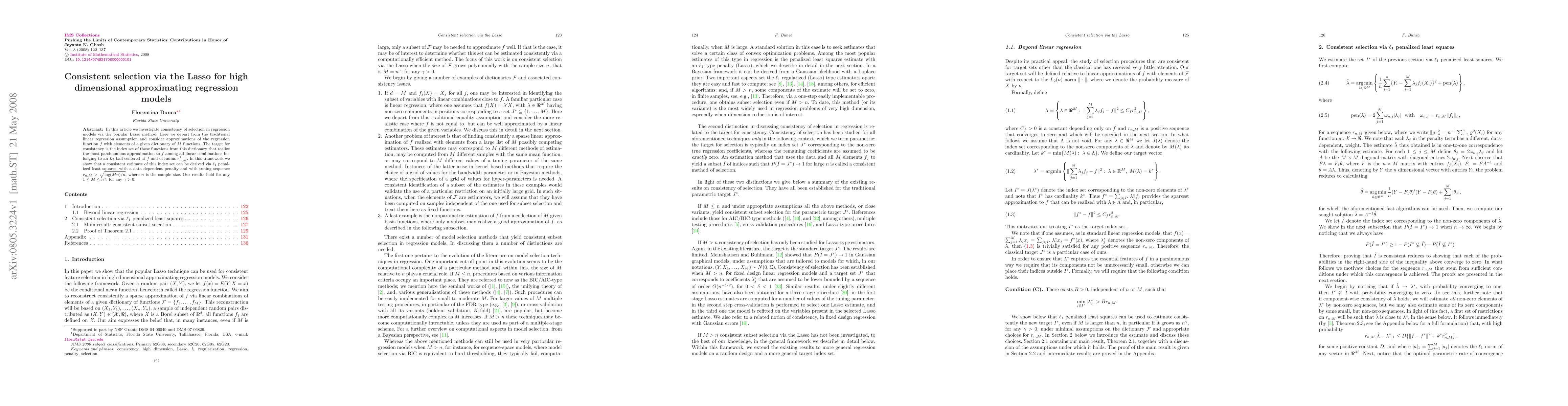 In this article we investigate consistency of selection in regression models via the popular Lasso method. Here we depart from the traditional linear regression assumption and consider approximations of the regression function $f$ with elements of a given dictionary of $M$ functions. The target for consistency is the index set of those functions from this dictionary that realize the most parsimonious approximation to $f$ among all linear combinations belonging to an $L_2$ ball centered at $f$ and of radius $r_{n,M}^2$. In this framework we show that a consistent estimate of this index set can be derived via $\ell_1$ penalized least squares, with a data dependent penalty and with tuning sequence $r_{n,M}>\sqrt{\log(Mn)/n}$, where $n$ is the sample size. Our results hold for any $1\leq M\leq n^{\gamma}$, for any $\gamma>0$.