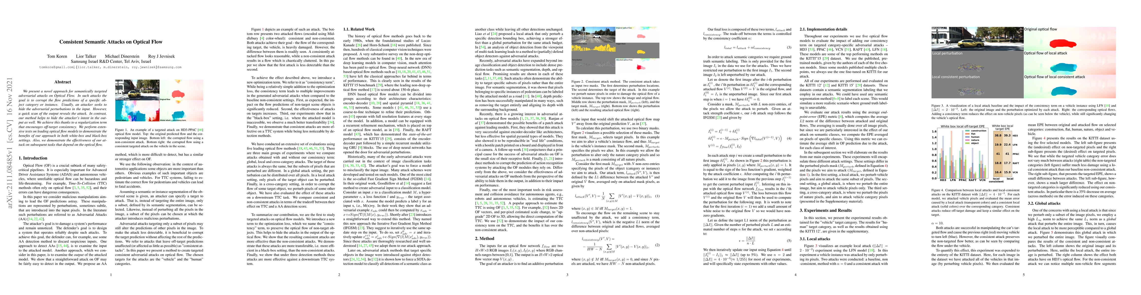 Researchers developed a method to hide the intent of semantic attacks on optical flow predictions, making it harder to detect. Their approach achieves this through an off-target consistency regularization term, which is effective in both white-box and black-box settings.