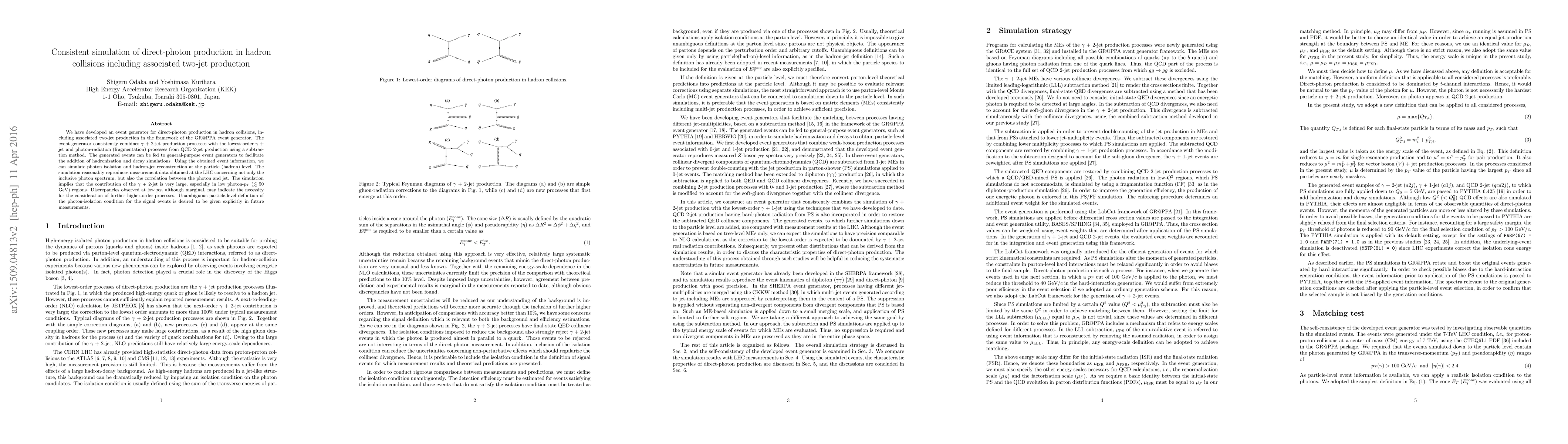 We have developed an event generator for direct-photon production in hadron collisions, including associated two-jet production in the framework of the GR@PPA event generator. The event generator consistently combines $\gamma$ + 2-jet production processes with the lowest-order $\gamma$ + jet and photon-radiation (fragmentation) processes from QCD 2-jet production using a subtraction method. The generated events can be fed to general-purpose event generators to facilitate the addition of hadronization and decay simulations. Using the obtained event information, we can simulate photon isolation and hadron-jet reconstruction at the particle (hadron) level. The simulation reasonably reproduces measurement data obtained at the LHC concerning not only the inclusive photon spectrum, but also the correlation between the photon and jet. The simulation implies that the contribution of the $\gamma$ + 2-jet is very large, especially in low photon-$p_{T}$ ($\lesssim$ 50 GeV) regions. Discrepancies observed at low $p_{T}$, although marginal, may indicate the necessity for the consideration of further higher-order processes. Unambiguous particle-level definition of the photon-isolation condition for the signal events is desired to be given explicitly in future measurements.