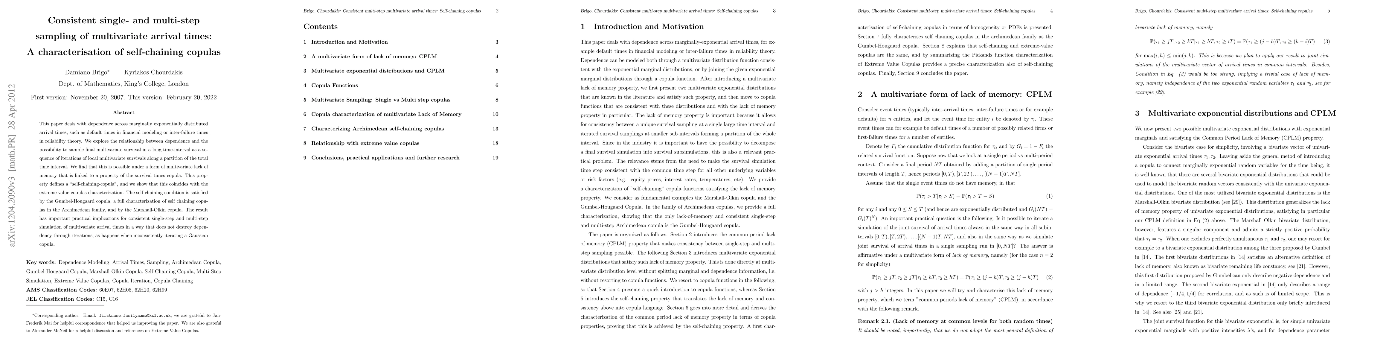 This paper characterizes self-chaining copulas for exponentially distributed arrival times, showing that extreme value copulas, including the Gumbel-Hougaard and Marshall-Olkin copulas, enable consistent single- and multi-step sampling without losing dependency across iterations.