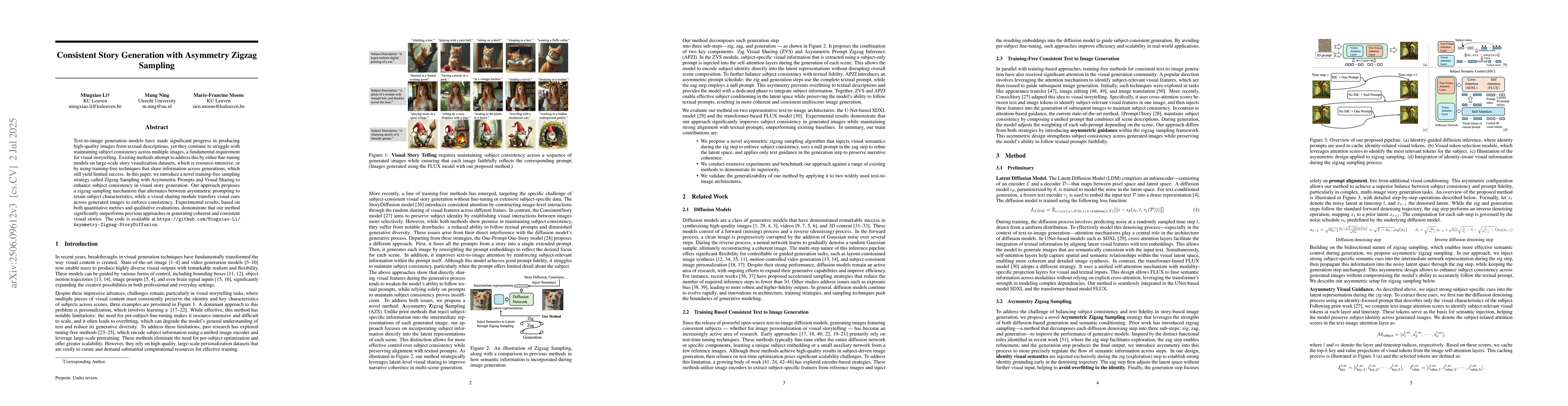 This paper introduces a novel training-free method for generating consistent visual stories through zigzag sampling with asymmetric prompts and visual sharing, outperforming previous approaches in coherence and consistency.