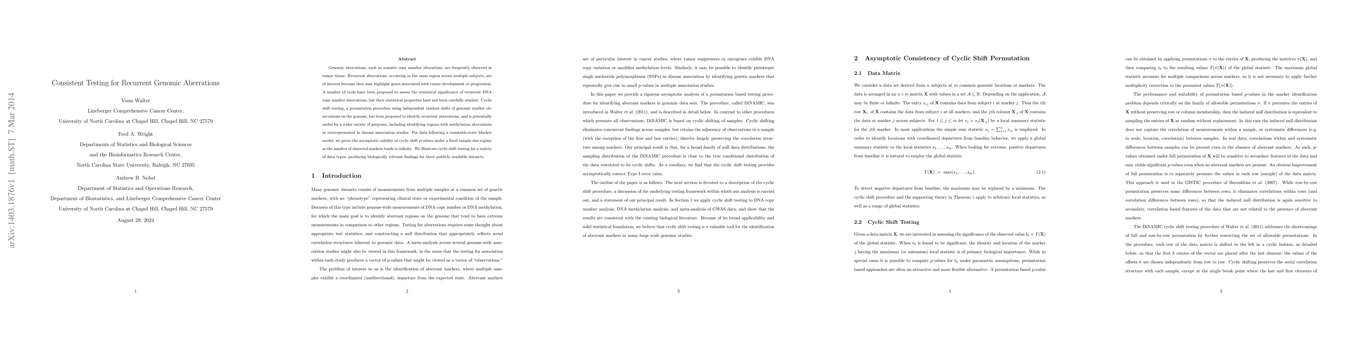 Genomic aberrations, such as somatic copy number alterations, are frequently observed in tumor tissue. Recurrent aberrations, occurring in the same region across multiple subjects, are of interest because they may highlight genes associated with tumor development or progression. A number of tools have been proposed to assess the statistical significance of recurrent DNA copy number aberrations, but their statistical properties have not been carefully studied. Cyclic shift testing, a permutation procedure using independent random shifts of genomic marker observations on the genome, has been proposed to identify recurrent aberrations, and is potentially useful for a wider variety of purposes, including identifying regions with methylation aberrations or overrepresented in disease association studies. For data following a countable-state Markov model, we prove the asymptotic validity of cyclic shift $p$-values under a fixed sample size regime as the number of observed markers tends to infinity. We illustrate cyclic shift testing for a variety of data types, producing biologically relevant findings for three publicly available datasets.